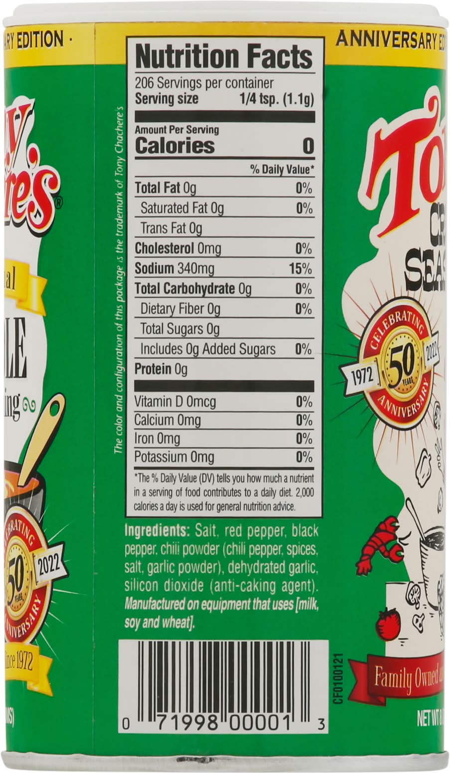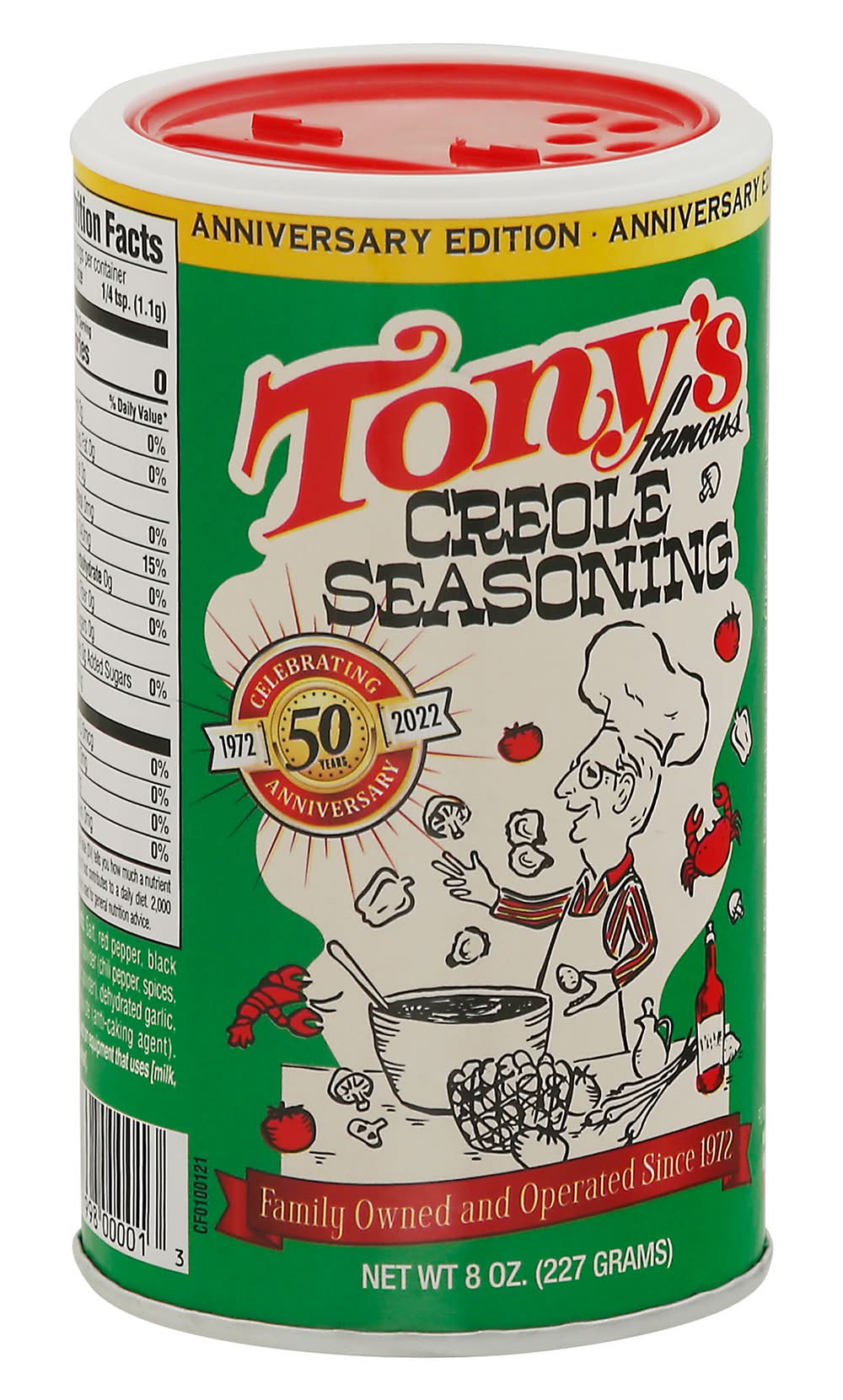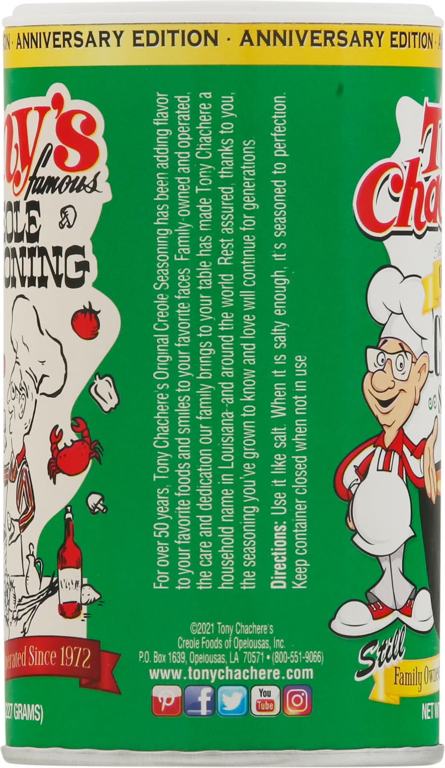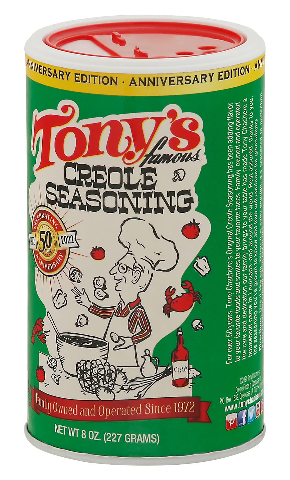 Creole Seasoning has been adding flavor to your favorite foods and smiles to your favorite faces Family owned and operated, the care and dedication our family brings to your table has made Tony Chachere a household name in Louisiana and around the world Rest assured, thanks to you, the seasoning you've grown to know and love will continue for generations. • Size: 8 OZ • Tony Chachere's Creole Foods of Opelousas, Inc., PO Box 1639,Opelousas,70571,LA