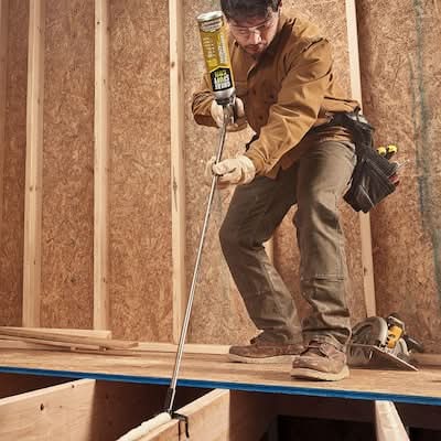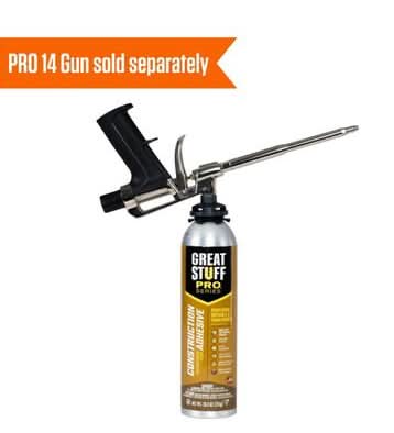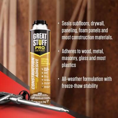 Heavy-duty GREAT STUFF PRO 26-1/2 oz. Construction Adhesive bonds to a variety of materials including wood and plywood, foam panels, drywall, masonry, concrete and tile. This indoor/outdoor formulation can be used with damp or even frozen lumber. GREAT STUFF PRO Construction Adhesive is applied using one of the GREAT STUFF PRO series dispensing guns.