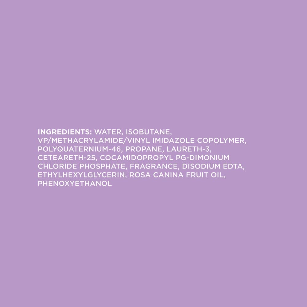 Water, Isobutane, VP/Methacrylamide/ Vinyl Imidazole Copolymer, Polyquaternium-46, Propane, Laureth-3, Ceteareth-25, Cocamidopropyl PGDimonium Chloride Phosphate, Fragrance, Disodium EDTA, Ethylhexylglycerin, Rosa Canina Fruit Oil, Phenoxyethanol
