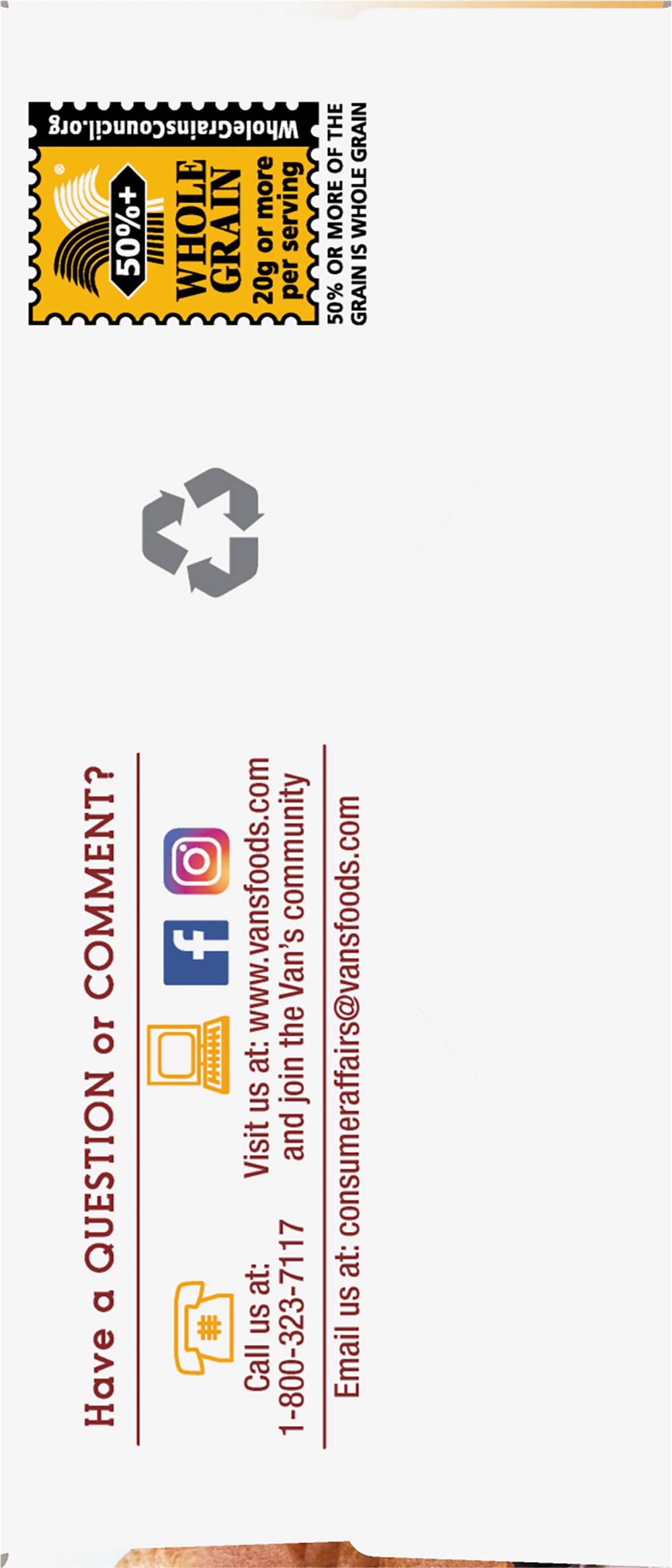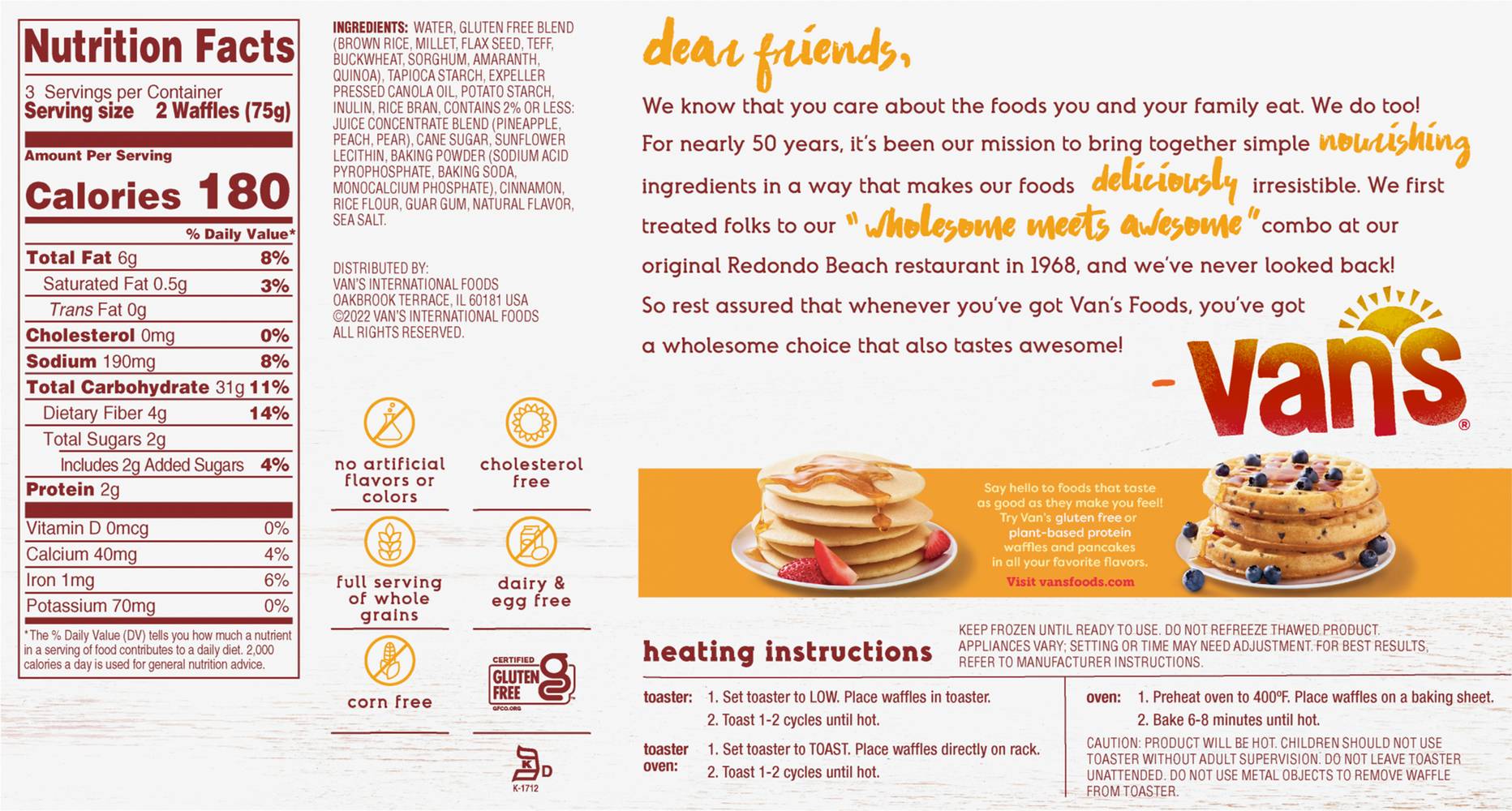 Waffles baked with brown rice, millet, flax seed, teff, buckwheat, sorghum, amaranth & quinoa. No artificial flavors, colors or preservatives. Certified gluten free. gfco.org. 50%+ Whole Grain: 20 g or more per serving. 50% or more of the grain is whole grain. wholegrainscouncil.org. Dairy & egg free. Cholesterol free. Non-GMO Project verified. nongmoproject.org. No high fructose corn syrup. Dear Friends, We know that you care about the foods you and your family eat. We do too! For nearly 50 years, it’s been our mission to bring together simple nourishing ingredients in a way that makes our foods deliciously irresistible. We first treated folks to our wholesome meets awesome combo at our original Redondo Beach restaurant in 1968, and we’ve never looked back! So rest assured that whenever you’ve got Van’s Foods, you’ve got a wholesome choice that also tastes awesome! – Vans. Say hello to foods that taste as good as they make you feel! Try Van's gluten free or plant-based protein waffles and pancakes in all your favorite flavors. www.vansfood.com. Facebook. Instagram. Visit vansfood.com. Have a question or comment? Call us at: 1-800-323-7117. Visit us at: www.vansfood.com and join the Van's community. Email us at: consumeraffairs@vansfood.com. • Alcohol by volume: 0% • Vans International Foods,