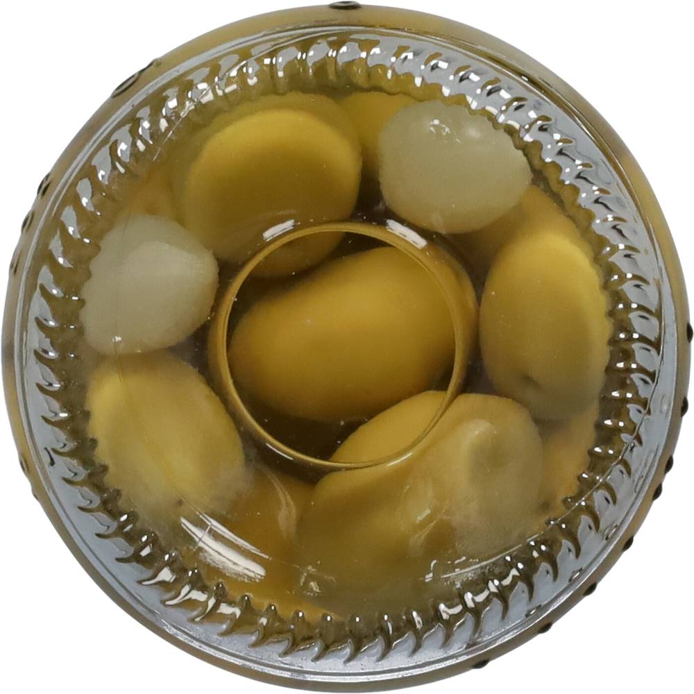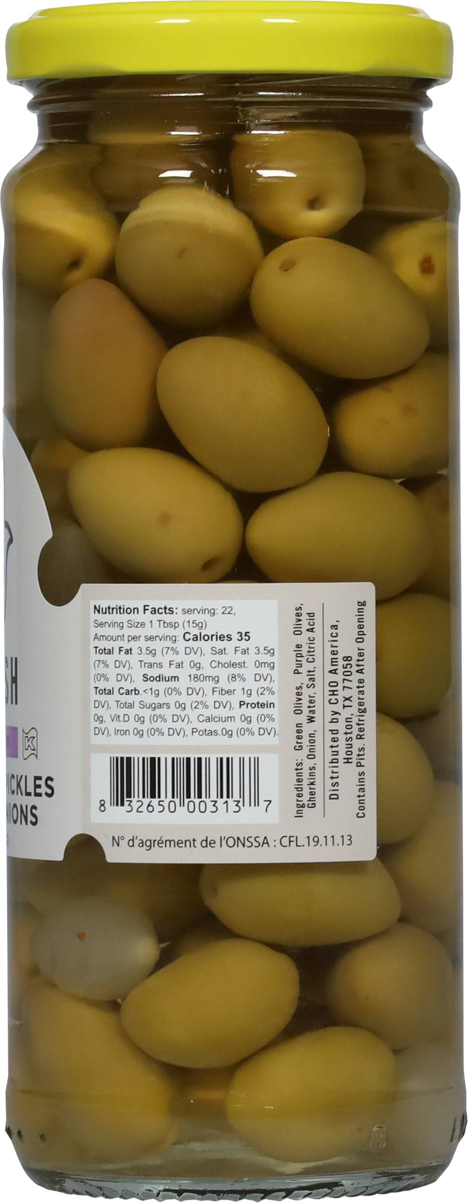 Green Olives, Purple Olives, Gherkins, Onion, Water, Salt, Citric Acid.