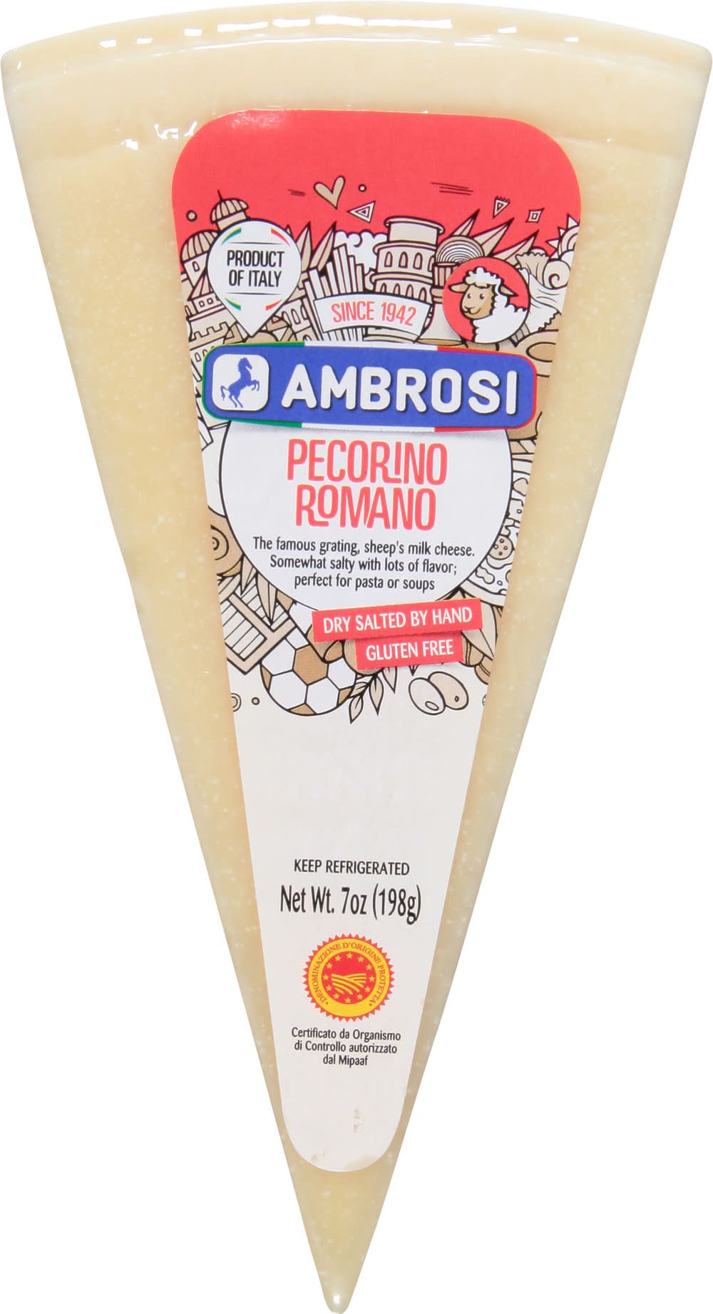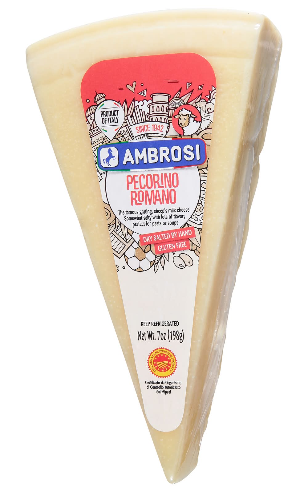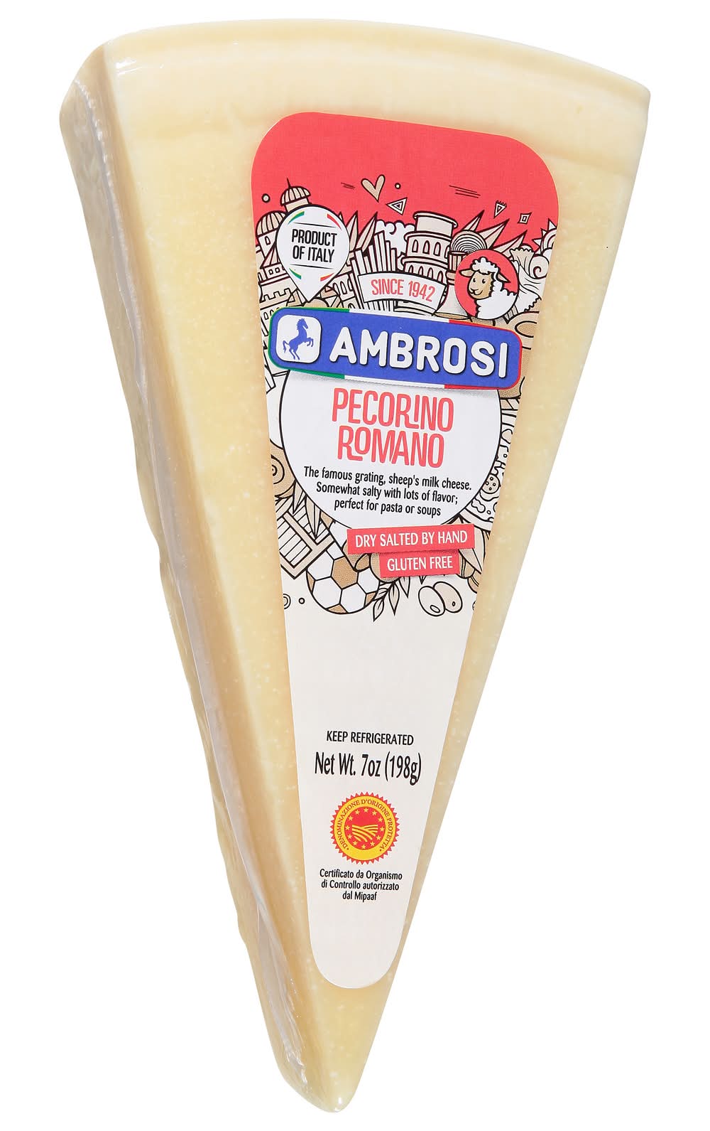 Gluten free. Since 1942. The famous grating, sheep's milk cheese. Somewhat salty with lots of flavor; perfect for pasta or soups. Dry salted by hand. Protected designation of origin. www.ambrosifoodsusa.com. (at)ambrosicheeseusa. Product of Italy. Ambrosi Food USA Corp., 61 Greenpoint Ave, Loft 508, Brooklyn, NY, 11222