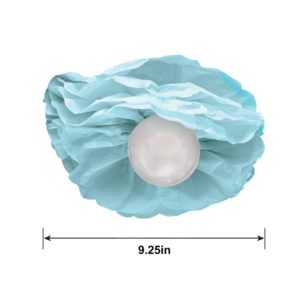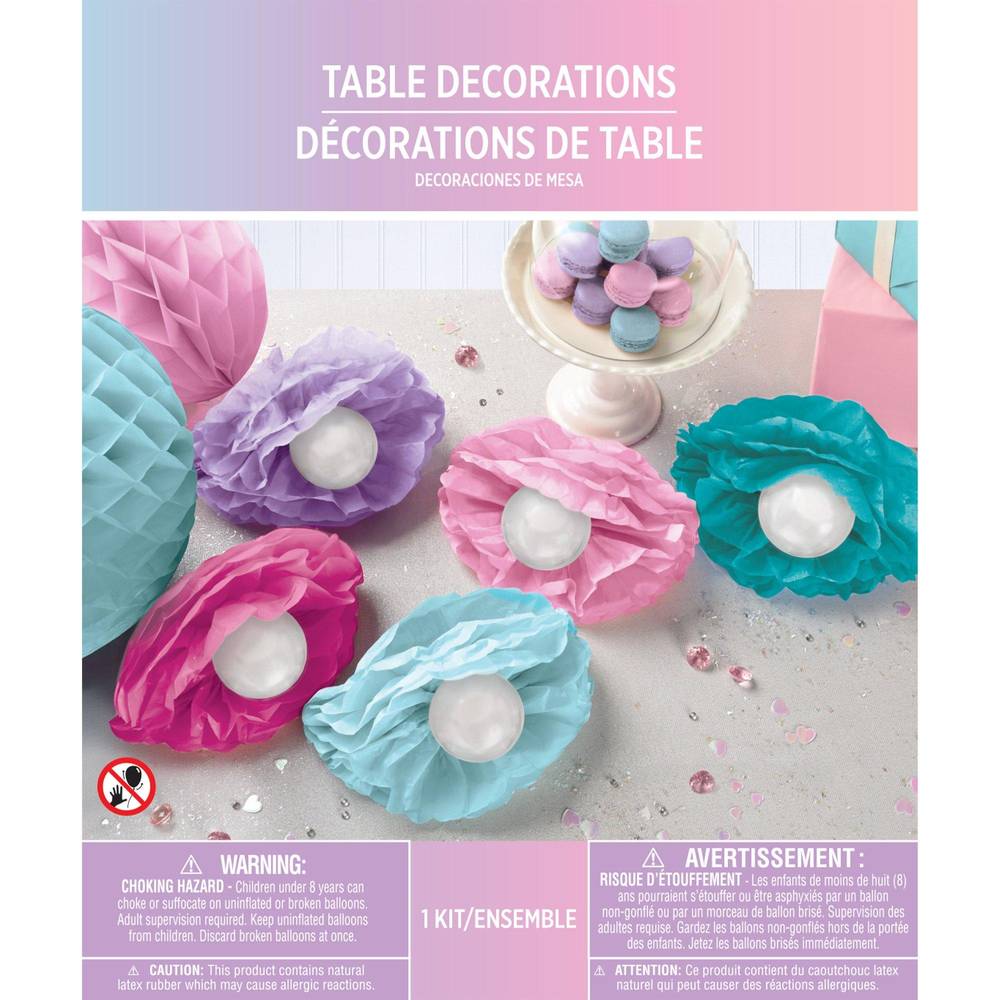 This table decorating kit creates five fluffy centerpieces, complete with opalescent pearls. Each pastel piece is a scalloped tissue paper "oyster" shell that you add a small pearly white balloon to. pbShimmering Mermaids Seashell Pearl Fluffy Table Decorating Kit product details:/b/p ul li10-piece decorating kit/li liIncludes ul li5 fluffy seashells, 9.25in wide/li li1 each of 5 colors: bright pink, light blue, pink, teal, and purple/li li5 pearl white balloons, 5in/li /ul /li liSimple assembly required/li liHoneycomb balls, cake stand, and confetti not included/li /ul