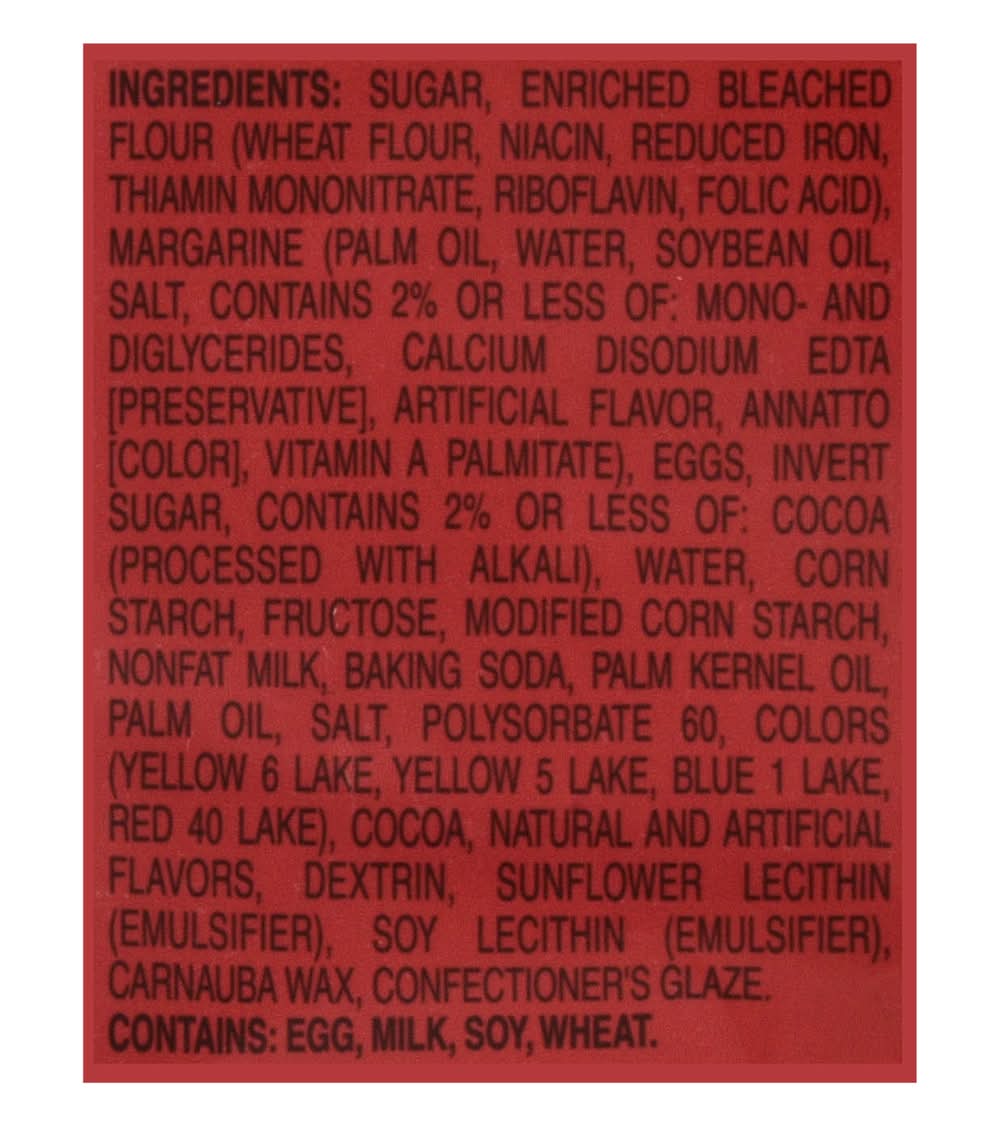 Sugar, Enriched Bleached Flour (Wheat Flour, Niacin, Reduced Iron, Thiamin Mononitrate, Riboflavin, Folic Acid), Margarine (Palm Oil, Water, Soybean Oil, Salt, Contains 2% or Less of: Mono-and Diglycerides, Calcium Disodium EDTA [Preservative], Artificial Flavor, Annatto [Color], Vitamin A Palmitate), Eggs, Invert Sugar, Contains 2% or Less of: Cocoa (Processed with Alkali), Water, Corn Starch, Fructose, Modified Corn Starch, Nonfat Milk, Baking Soda, Palm Kernel Oil, Palm Oil, Salt, Polysorbate 60, Colors (Yellow 6 Lake, Yellow 5 Lake, Blue 1 Lake, Red 40 Lake), Cocoa, Natural and Artificial Flavors, Dextrin, Sunflower Lecithin (Emulsifier), Soy Lecithin (Emulsifier), Carnauba Wax, Confectioner's Glaze Contains: Soybeans, Eggs, Milk, Wheat