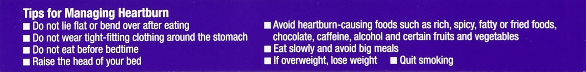 Directions: In Each Tablet Directions: 14-Day Course of Treatment: Take 1 tablet before eating in the morning. Do not crush or chew tablets. Place the tablet on tongue; tablet disintegrates, with or without water. The tablets can also be swallowed whole with water. Take every day for 14 days. Do not take more than 1 tablet a day. Do not use for more than 14 days unless directed by your doctor. Do not take this medicine with alcohol. Repeated 14-Day Course (If Needed): You may repeat a 14-day course every 4 months. Do not take for more than 14 days or more often than every 4 months unless directed by a doctor. For Adults 18 Years of Age and Older: This product is to be used once a day (every 24 hours), every day for 14 days. It may take 1 to 4 days for full effect; some people get complete relief of symptoms within 24 hours. Children Under 18 Years of Age: Ask a doctor before use. Heartburn in children may sometimes be caused by a serious condition.