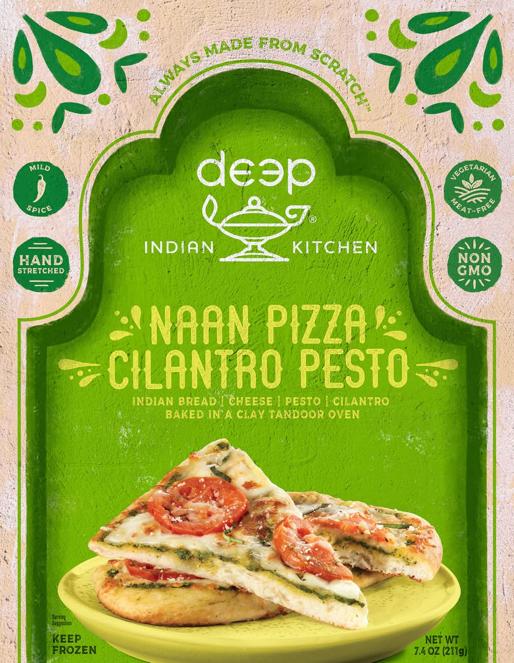 Indian bread. Cheese. Pesto. Cilantro. Baked in a clay tandoori oven. Vegetarian meat-free. Non GMO. Always made from scratch. Hand stretched. Welcome to India: And welcome to our family’s kitchen. Surprised we're serving pizza? Don't be! In India, many street carts offer pizza with an Indian twist. In that tradition, we bring you our Cilantro Pesto Pizza. We start with our hand-stretched naan and add pesto, mozzarella, tomatoes, cilantro, and other seasonings. Then we bake it in a tandoor oven until the aromas draw everyone in for a slice! This Dish is Prepared with: Cilantro, mozzarella cheese pesto & tomatoes in a tandoor oven. deepindiankitchen.com. Dive Deeper: (at)deepindiankitchen. To our family, the name Deep is, well, deep. In India it means lamp and enlightenment, and our mission is to share the best of India’s culture with everyone. That’s why we care so much about our food and every purchase benefits our Deepkiran (Ray of Light) Foundation, which helps children in rural India access education. Children we support each year 22,000+. Product of India. • Deep Foods, Inc., • Packaging: Reusable