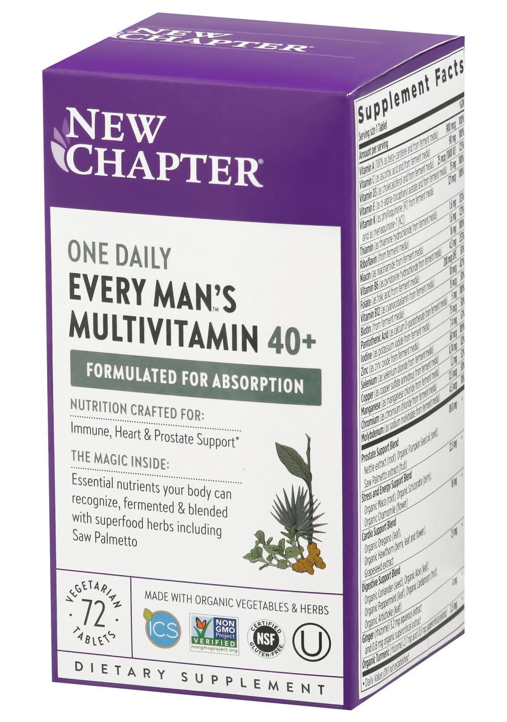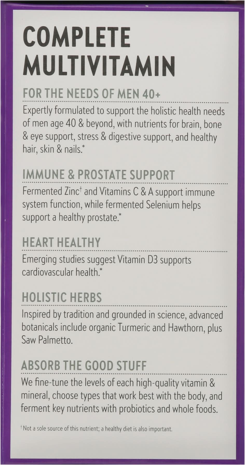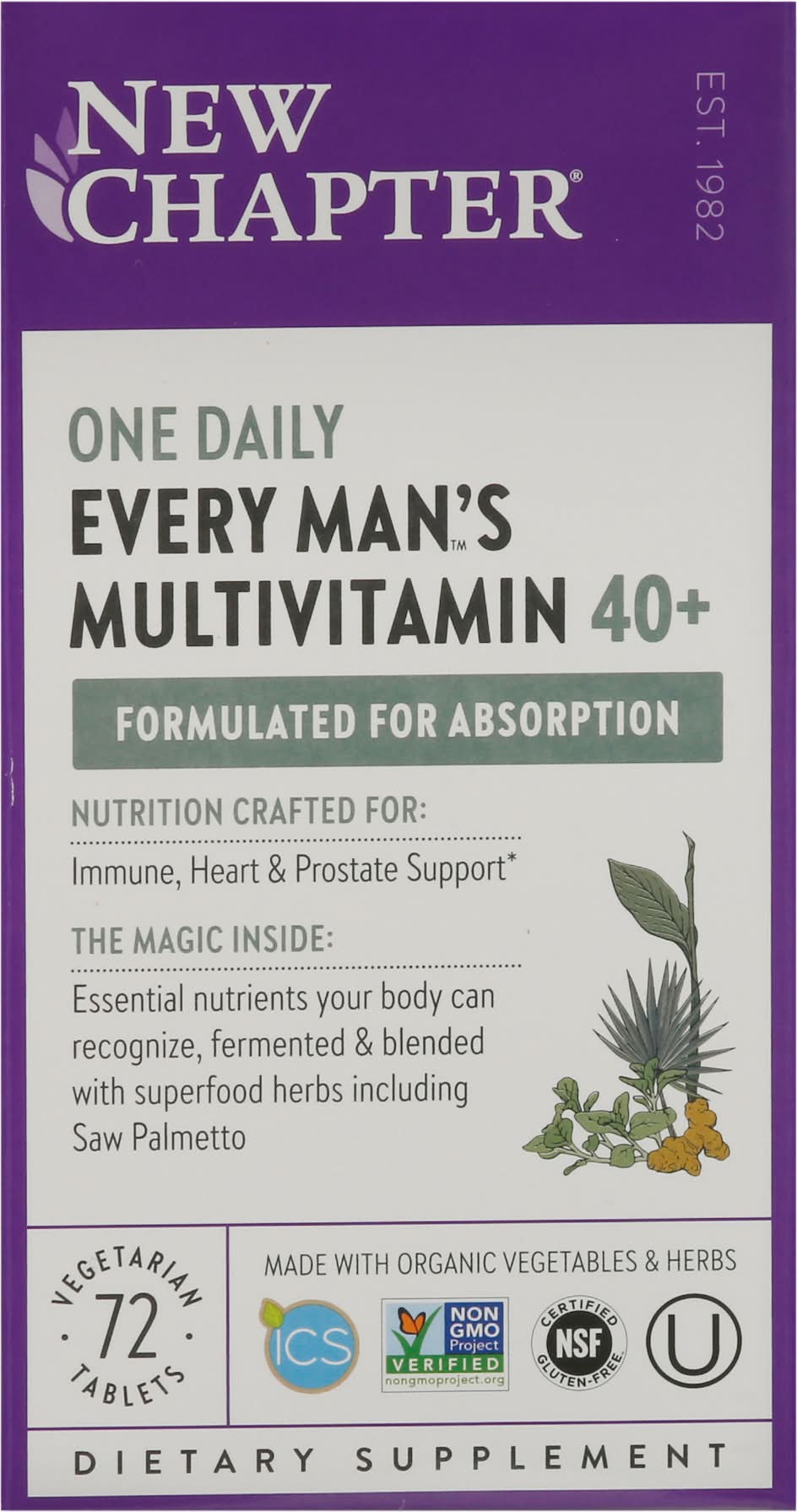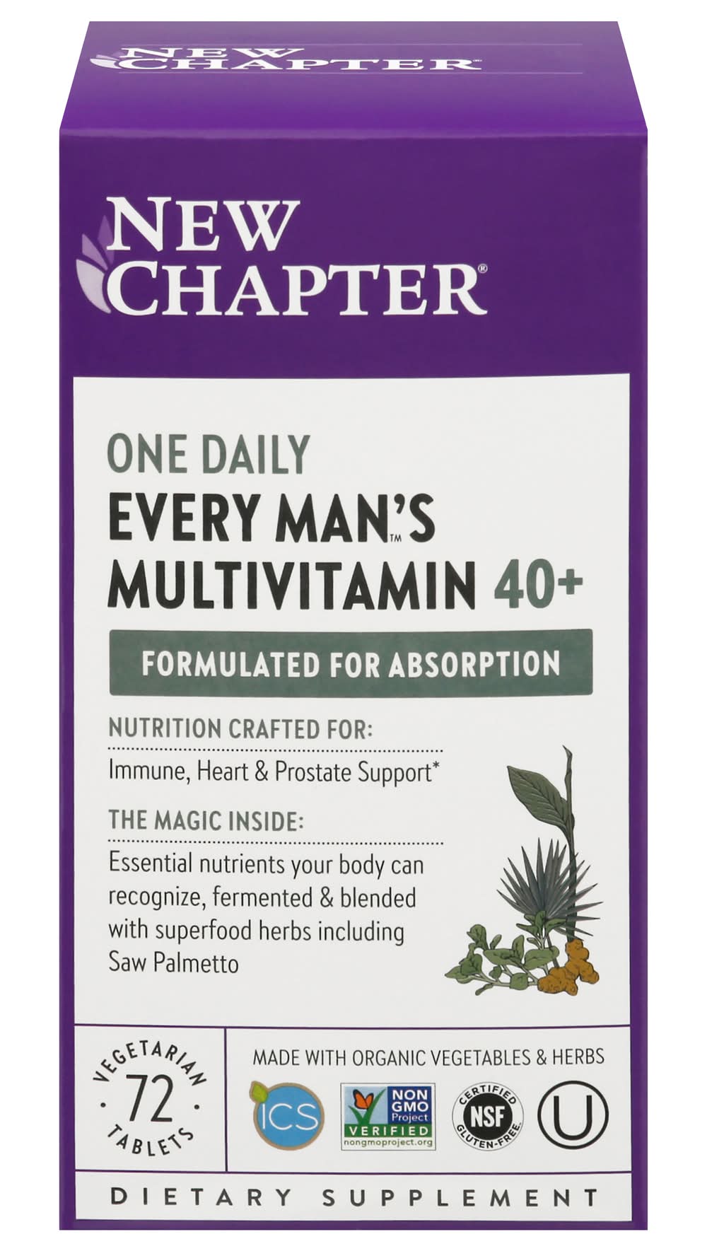 Dietary Supplement. 40+. No artificial flavors or colors. ICS. Certified Organic by International Certification Services, Inc., Medina, ND, USA. NSF Certified Gluten-free. Certified Gluten-Free by NSF. 100% vegetarian. Non GMO Project verified. nongmoproject.org. Est. 1982. Formulated for absorption. Nutrition Crafted For: Immune, heart & prostate support. The Magic Inside: Essential nutrients your body can recognize, fermented & blended with superfood herbs including Saw Palmetto. Complete Multivitamin: For the Needs of Men 40+: Expertly formulated to support the holistic health needs of men age 40 & beyond, with nutrients for brain, bone & eye support, stress & digestive support, and healthy hair, skin & nails. Immune & Prostate: Support: Fermented Zinc (Not a sole source of this nutrient; a healthy diet is also important) and Vitamins C & A support immune system function, while fermented Selenium helps support a healthy prostate. Heart Healthy: Emerging studies suggest Vitamin D3 supports cardiovascular health. Holistic Herbs: Inspired by tradition and grounded in science, advanced botanicals include organic Turmeric and Hawthorn, plus Saw Palmetto. Absorb the Good Stuff: We fine-tune the levels of each high-quality vitamin & mineral, choose types that work best with the body, and ferment key nutrients with probiotics and whole foods. The New Chapter Money-Back Guarantee: We proudly stand behind every product we make. However, if you are not satisfied, please visit www.newchapter.com/guarantee for refund details. For questions or comments call 888-874-4461. Certified B Corporation: This company meets the highest standards of social and environmental impact. Please recycle this box after use. (These statements have not been evaluated by the Food and Drug Administration. This product is not intended to diagnose, treat, cure, or prevent any disease.) Manufactured in the US from globally sourced ingredients. Packaging: Reusable