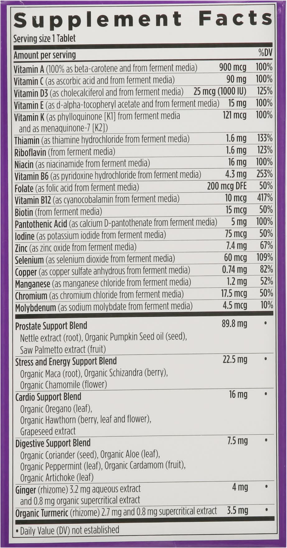 Ingredients: Prostate Support Blend: Nettle Extract (Root), Organic Pumpkin Seed Oil (Seed), Saw Palmetto Extract (Fruit). Stress and Energy Support Blend: Organic Maca (Root), Organic Schizandra (Berry), Organic Chamomile (Flower). Cardio Support Blend: Organic Oregano (Leaf), Organic Hawthorn (Berry Leaf and Flower), Grapeseed Extract. Digestive Support Blend: Organic Coriander (Seed), Organic Aloe (Leaf), Organic Peppermint (Leaf), Organic Cardamom (Fruit), Organic Artichoke (Leaf). Other Ingredients: Ferment Media (Organic Soy Flour Organic Saccharomyces Cerevisiae Organic Orange Peel Powder Organic Alfalfa Powder Bromelain [Deactivated] Papain [Deactivated] Organic Carrot Powder and Lactic Acid Bacteria [Lactobacillus Acidophilus Lactobacillus Rhamnosus and Bifidobacterium Bifidum]), Organic Coating/Binder (Organic Maltodextrin Organic Gum Acacia Organic Sunflower Lecithin Organic Palm Oil and Organic Guar Gum), Organic Fiber Blend (Organic Rice Flour Organic Oat Fiber and Organic Sunflower Lecithin), Silica, Sodium Alginate, Pea Starch and Organic Gum Acacia Contains: Soybeans