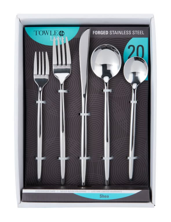 This Towle Living Shea 20-Piece Flatware Set brings delicate design to your tabletop while making a bold impression. Strikingly slender, this unique flatware is an enthralling combination of clean lines and gentle, ultra modern curves, and complements any dinnerware or stemware. Flatware is constructed of stainless steel to stand up to the rigors of everyday use and never needs polishing. 20-piece set, service for 4, includes 4 each of: dinner fork, dinner knife, dinner spoon, salad fork, and teaspoon. Dishwasher safe Color: Silver