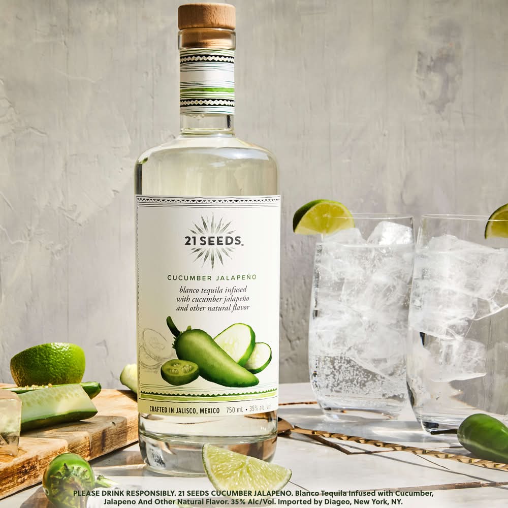 Experience the flavor of simplicity with 21Seeds Cucumber Jalapeno Infused Tequila. With bright, crisp notes of cucumber and a spicy finish, our tequila blanco infused with the juice of real fruit offers the perfect balance of smooth flavor and fresh scent. 21Seeds crafts its award-winning tequila alcohol by slow cooking agaves from Jalisco. The double distilling and cold filtering processes result in a blanco base ready to be infused with the juice of real fruit for the perfect tequila gift with incredible taste. Best enjoyed in a Seed & Soda cocktail. Includes one 70 proof 1 L bottle of 21Seeds Cucumber Jalapeno Infused Tequila. Please drink responsibly. Alcohol by volume: 35%