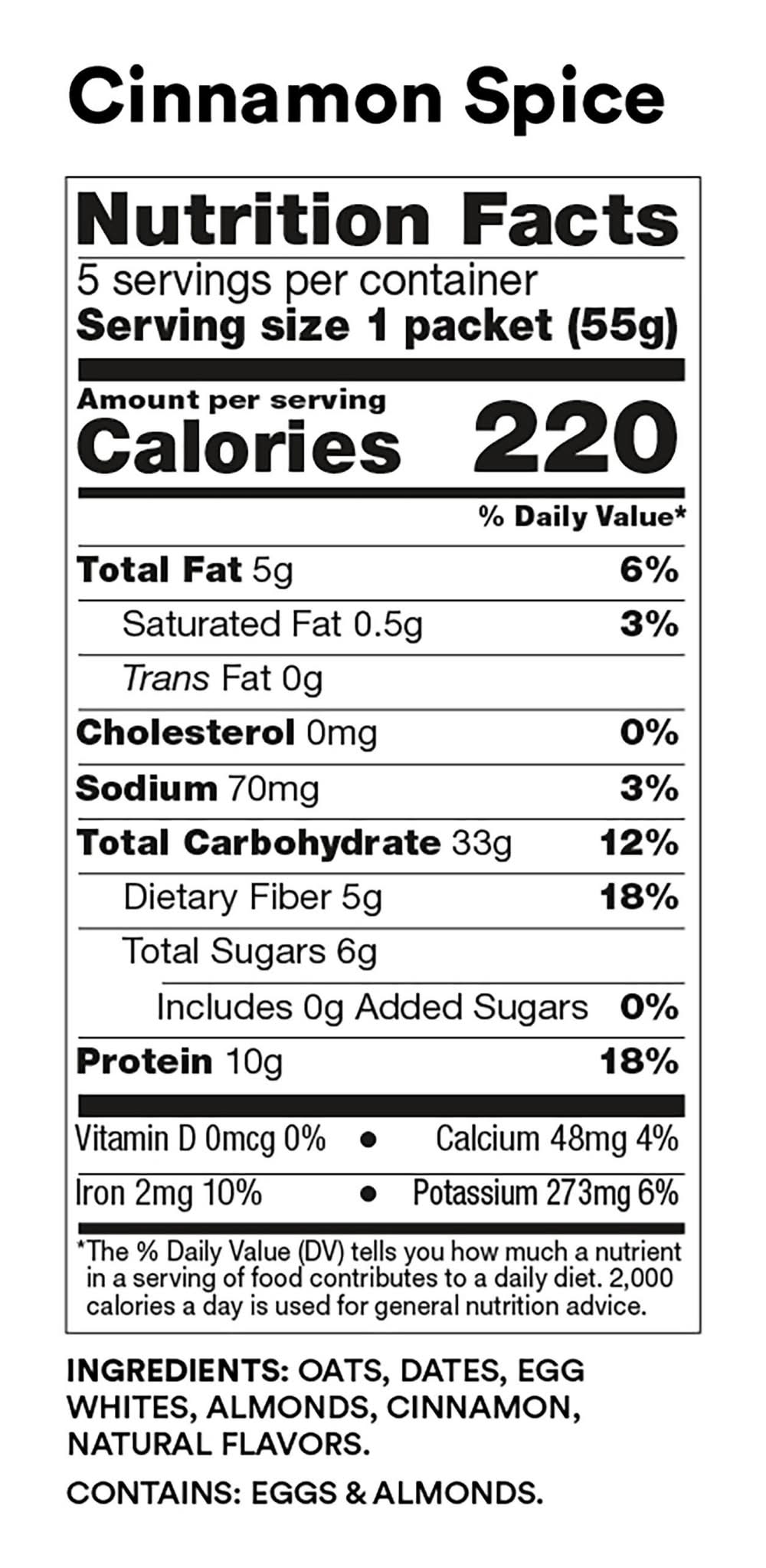 Ingredients: Oats, Dates, Egg Whites, Almonds, Cinnamon, Natural Flavors. Contains: CONTAINS: EGGS & ALMONDS. MAY CONTAIN MILK, EGGS, TREE NUTS, WHEAT AND SOY.