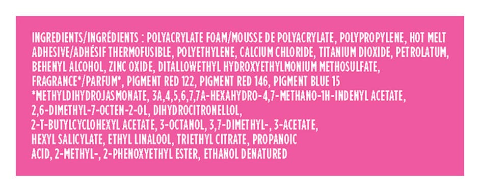 Ingredients: Polyacrylate Foam/Mousse De Polyacrylate, Polypropylene, Hot Melt Adhesive/Adhésif Thermofusible, Polyethylene, Calcium Chloride, Titanium Dioxide, Petrolatum, Behenyl Alcohol, Zinc Oxide, Ditallowethyl Hydroxyethylmonium Methosulfate, Fragrance*/Parfum*, Pigment Red 122, Pigment Red 146, Pigment Blue 15, *Methyldihy Drojas Monate, 3a, 4.5.6.7.7 a-Hexahydro-4.7- Methano-1h-Indenyl Acetate, 2.6-Dimethyl-7-Octen-2-0l, Dihydrocitrohellol, 2-T-Butylcyclo Hexyl Acetate, 3-Octanol, 3.7-Dimethyl, 3-Acetate, Hexyl Salicylate, Ethyl Linalool, Triethyl Citrate, Propanoic Acid, 2-Methyl, 2-Phenoxyethyl Ester, Ethanol Denatured