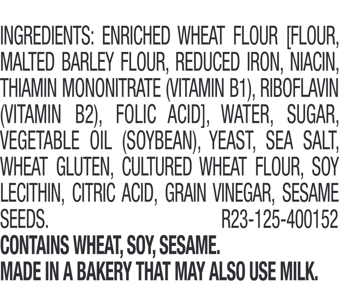 ENRICHED WHEAT FLOUR [FLOUR, MALTED BARLEY FLOUR, REDUCED IRON, NIACIN, THIAMIN MONONITRATE (VITAMIN B1), RIBOFLAVIN (VITAMIN B2), FOLIC ACID], WATER, SUGAR, VEGETABLE OIL (SOYBEAN), YEAST, SEA SALT, WHEAT GLUTEN, CULTURED WHEAT FLOUR, SOY LECITHIN, CITRIC ACID, GRAIN VINEGAR, SESAME SEEDS. Contains: CONTAINS SESAME, SOY, WHEAT.