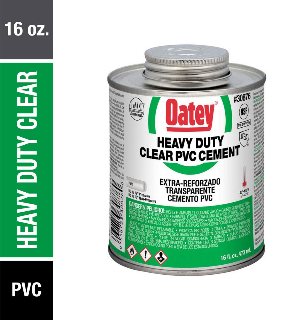 Oatey PVC Heavy Duty Medium Set Clear Cement is recommended for DWV, pressure pipe, potable water and electrical applications. Its thick formula fills gaps in large diameter pipe and loose-fitting joints and is easy to apply with included in-lid dauber. This clear, heavy duty, medium set cement can be used to solvent weld all schedules and classes of PVC pipe and fittings with interference fit up to 18 in. diameter for non-pressure and 12 in. diameter for pressu ⚠ WARNING: Cancer - www.P65Warnings.ca.gov