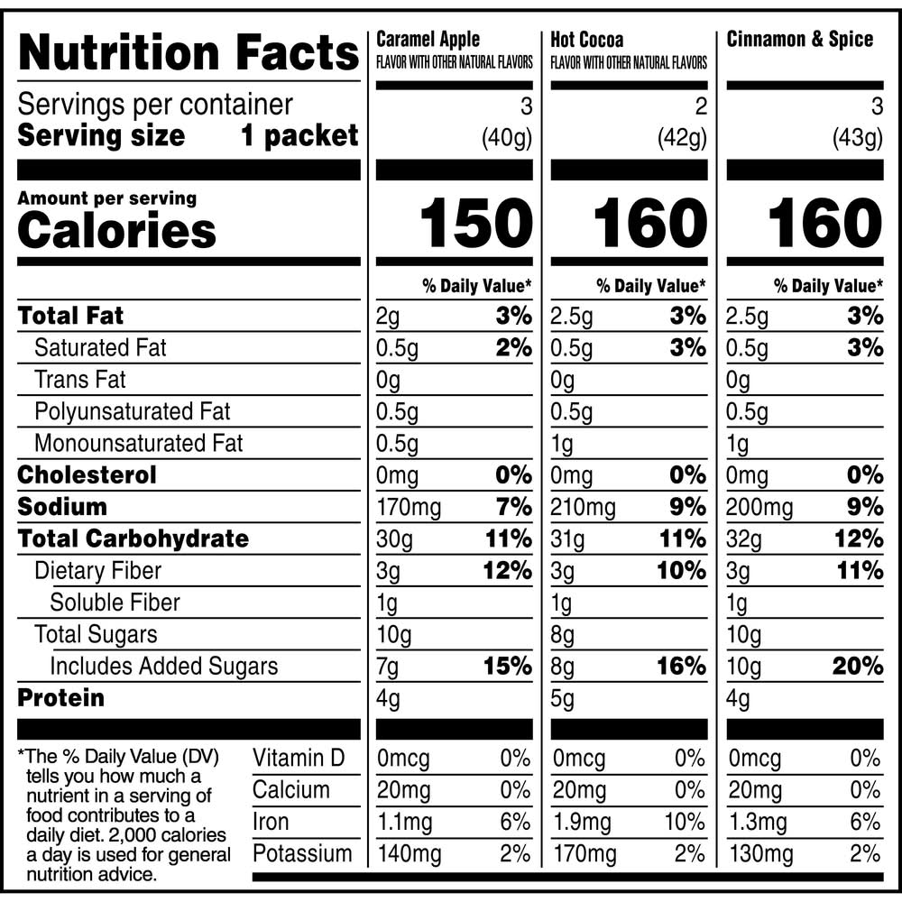 Hot Water or Milk Directions: 1. Empty packet into bowl. 2. Add up to 1/2 (For caramel apple, use 1/2 cup). 3. Let stand for 60 seconds. Microwave: Microwave Directions: 1. Empty packet into microwave-safe bowl. 2. Add up 2/3 (For caramel apple, use 1/2 cup) cup unheated milk or water, stir. For your convenience, you can use the packet as a measuring cup. 3. Microwave on high 1 to 2 minutes; stir again. Please adjust water or milk for desired consistency. Please adjust water or milk for desired consistency. Caution: Bowl and contents may be hot. Microwave ovens vary in power. Cooking time may need to be adjusted. Lift tab to open or remove flap along perforation on the back of box for a convenient pantry pack.