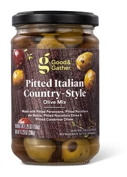Complete your meat and cheese board with this Italian Country Style Pitted Olive Mix from Good & Gather. This olive mix is made with pitted Peranaza, pitted Nocellara del Belice, pitted Nocellara Etna and pitted Calabrese olives that pair well with a variety of cured meats and cheeses. This Italian country-style olive mix has no artificial flavors or synthetic colors and the olives are all pre-pitted so they’re ready to eat right out of the jar. Enjoy them as a flavorful snack on their own or add them as a savory component of a charcuterie board or snack spread. Every product that carries the Good & Gather name starts with quality ingredients that deliver great taste, making it easier for you and your family to eat well every day. We promise you’ll love each bite or your money back.
