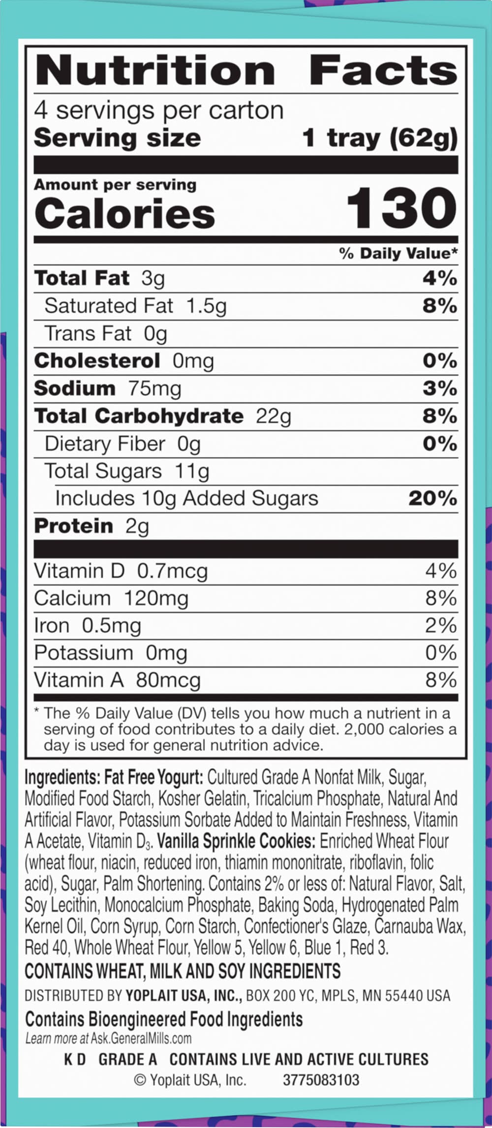 Fat free yogurt & vanilla cookies naturally flavored. Naturally and artificially flavored. Per Tray: 130 calories; 1.5 g sat fat (8% DV); 75 mg sodium (3% DV); 11 g total sugars. Fat free. Contains bioengineered food ingredients. Learn more at Ask.GeneralMills.com. www.Yoplait.com. how2recycle.info. Comments? Save carton and call 1-800-967-5248. www.Yoplait.com. Box Tops for Education: Download the App. Scan your receipt. Earn cash for schools. Yoplait USA, Inc.,