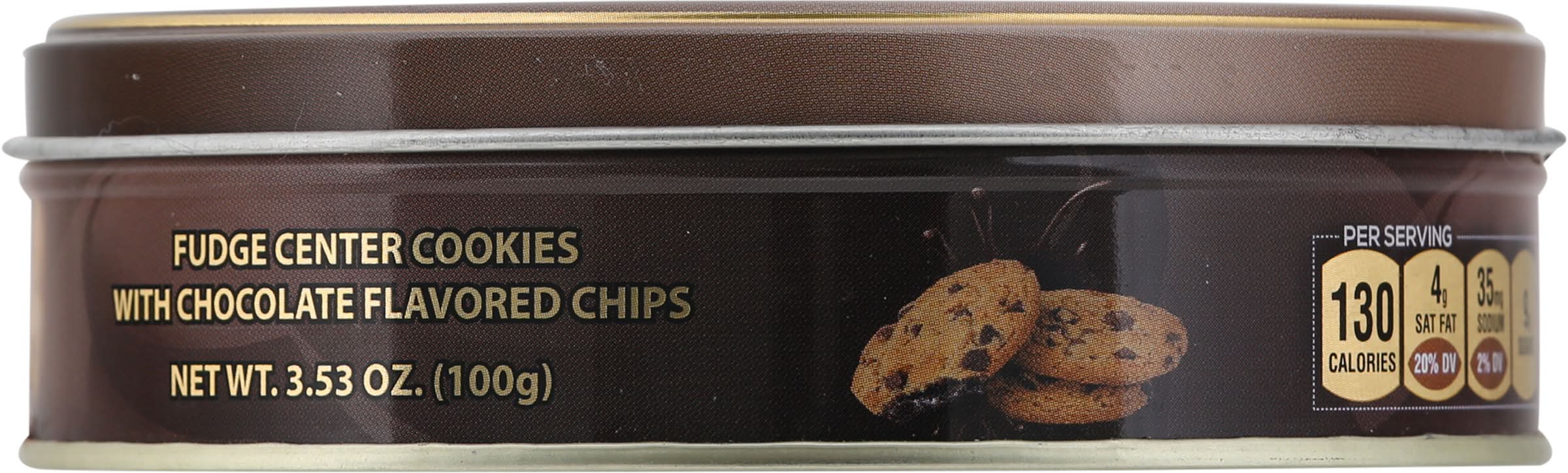 Fudge center cookies with chocolate flavored chips. Per Serving: 130 calories; 4 g sat fat (20% DV); 35 mg sodium (2% DV); 9 g sugars. www.gbrands.us. Product of India. Global Brands LLC,