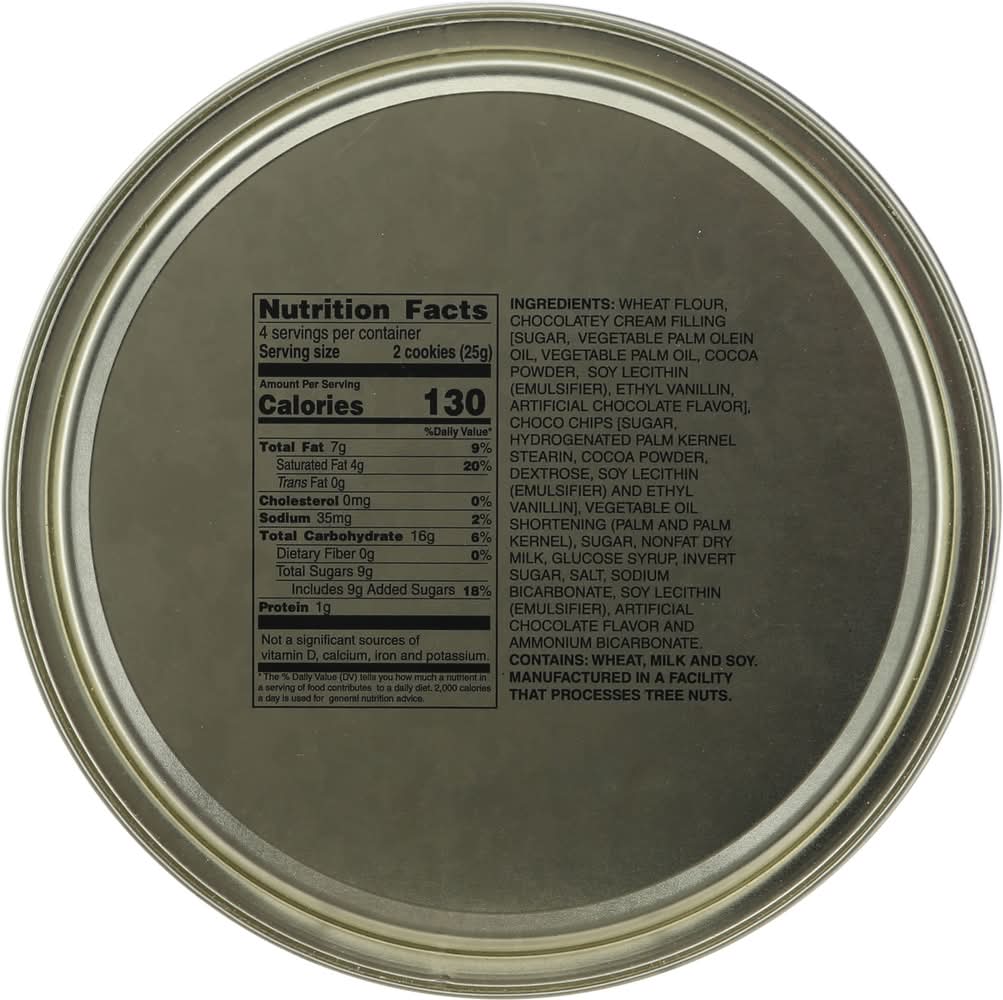 Wheat Flour, Chocolatey Cream Filling [Sugar, Vegetable Palm Olein Oil, Vegetable Palm Oil, Cocoa Powder, Soy Lecithin (Emulsifier), Ethyl Vanillin, Artificial Chocolate Flavor], Choco Chips [Sugar, Hydrogenated Palm Kernel Stearin, Cocoa Powder, Dextrose, Soy Lecithin (Emulsifier) and Ethyl Vanillin], Vegetable Oil Shortening (Palm and Palm Kernel), Sugar, Nonfat Dry Milk, Glucose Syrup, Invert Sugar, Salt, Sodium Bicarbonate, Soy Lecithin (Emulsifier), Artificial Chocolate Flavor and Ammonium Bicarbonate Contains: Wheat, Milk, Soybeans, Tree Nuts Additives: None