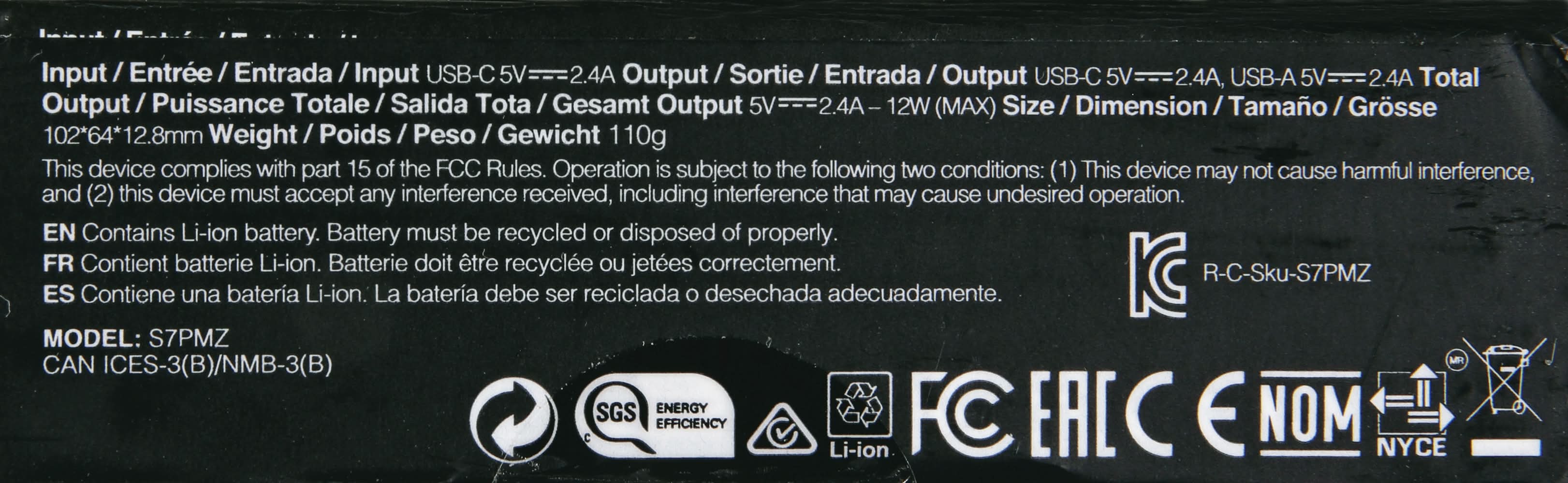 S7PMZ Power in your pocket. Up to 20 hours of power. Battery life percentage display. Micro USB and USB-C charging cable. Check Your Charge Level: 0-100% power indicator. Split: Cable Included Micro USB and USB-C charging from one cable. Power and Looks: Soft touch finish. Contents: Battery pack; Split Charging cable; User guide; 1-year warranty. Safety information inside. FCC listed. CE listed. This device complies with part 15 of the FCC rules. Operation is subject to the following two conditions: (1) This device many not cause harmful interference, and (2) this device must accept any interference received, including interference that may cause undesired operation. Skullcandy.com. SGS Energy efficiency. Made in China. • Skullcandy Inc, • Packaging: Reusable
