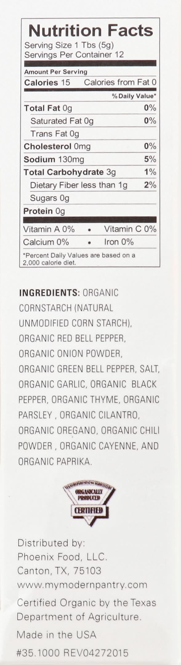 Organic Cornstarch (Natural Unmodified Corn Starch), Organic Red Bell Pepper, Organic Onion Powder, Organic Green Bell Pepper, Salt, Organic Garlic, Organic Black Pepper, Organic Thyme, Organic Parsley, Organic Cilantro, Organic Oregano, Organic Chili Powder, Organic Cayenne, and Organic Paprika