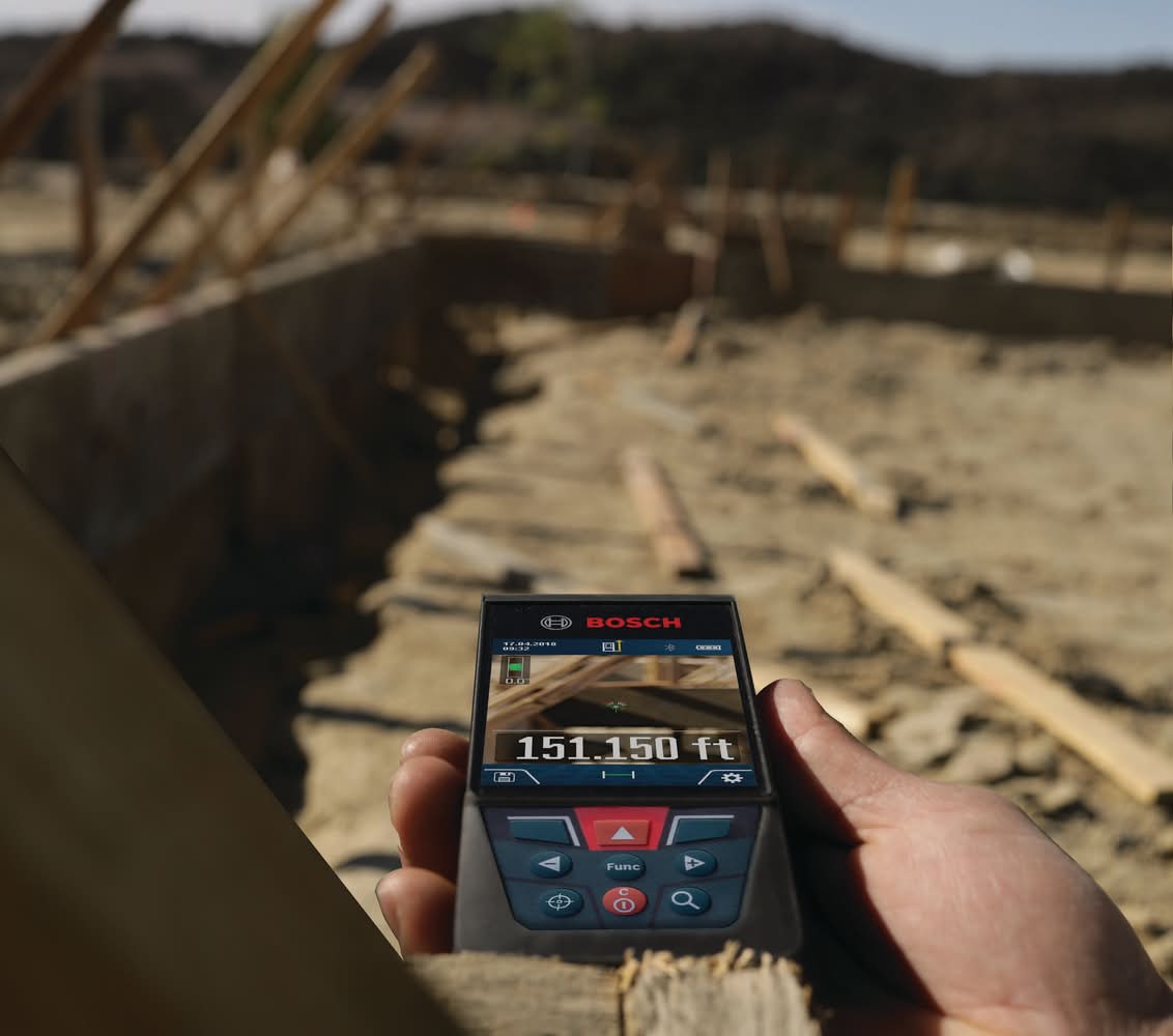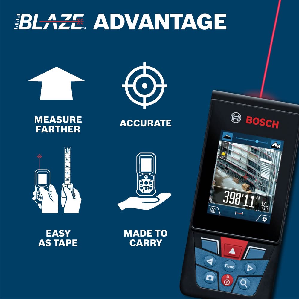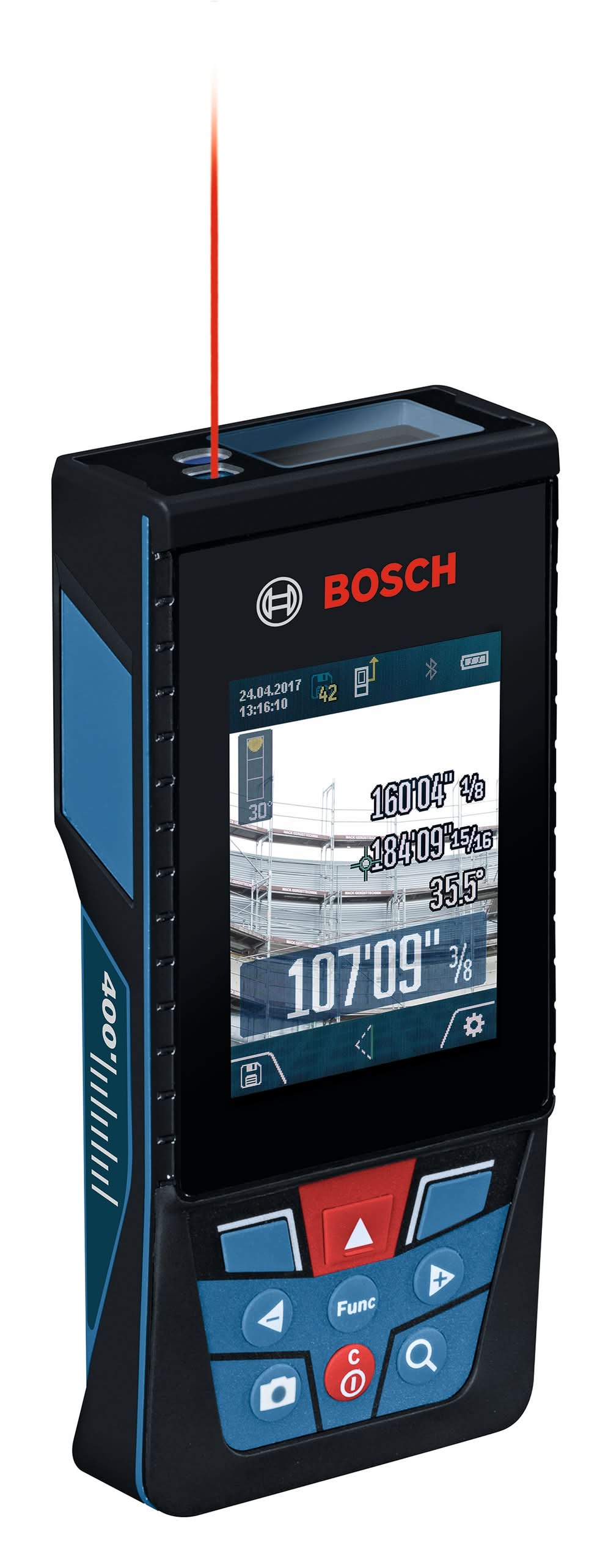 BLAZE Outdoor technology – outdoor laser measuring device that pairs accurate, long-distance (up to 400 Ft.) measuring and digital viewfinder with next-gen, connected convenience to simplify project management through the free Bosch MeasureOn app. Digital Viewfinder – features adjustable zoom to locate the laser spot at far distances, even outdoors or in busy backgrounds. Bluetooth connectivity – connects the laser distance meter to smart phone or tablet, enabling transfer measurements onto images and manage the project through the free MeasureOn app. Easy-to-read backlit color display – illuminates numbers in dark areas with distinct resolution, allowing work in low-light or no-light conditions. Reinforced screen glass – provides increased durability and damage resistance. Inclinometer – shows the tilt angle, 360 degree for easy angle and indirect measurements. Default real-time measurement mode – immediately provides accurate measurement that automatica Use Location: Outdoor Color: Yes