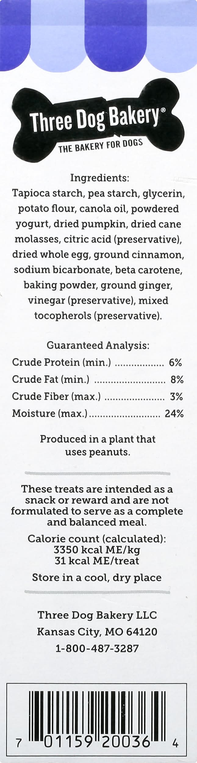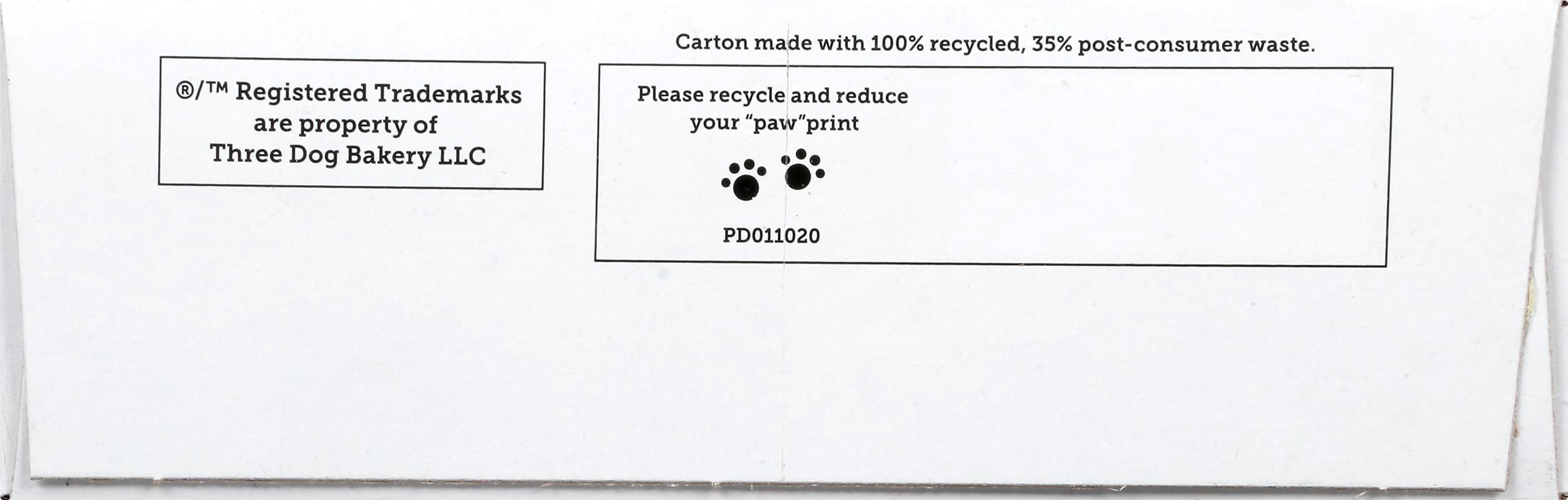 Calorie Count (Calculated): 3350 kcal ME/kg. 31 kcal ME/treat. No artificial flavors. The original. Estd. 1989. Bakery for dogs. A taste of the bakery in every treat. Crafted with love & real ingredients. At Three Dog Bakery we believe dogs are family and deserve the very best. For over 30 years, our pastry chefs have put the magic of dogged devotion into every fresh baked treat they make. It doesn't matter if you and your pup are heading off on a pawsome adventure or planning a gotcha day party, when you give one of our treats it turns an ordinary moment into something special! These treats are intended as a snack or reward and are not formulated to serve as a complete and balanced meal. Real ingredients. www.threedog.com. Facebook. Instagram. Twitter. See what's baking at: www.threedog.com. Carton made with 100% recycled. 35% post-consumer waste. Please recycle and reduce your paw print. Baked in the USA.