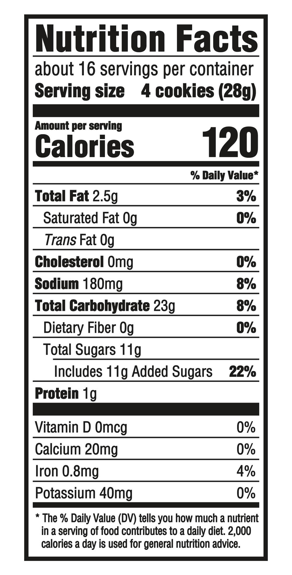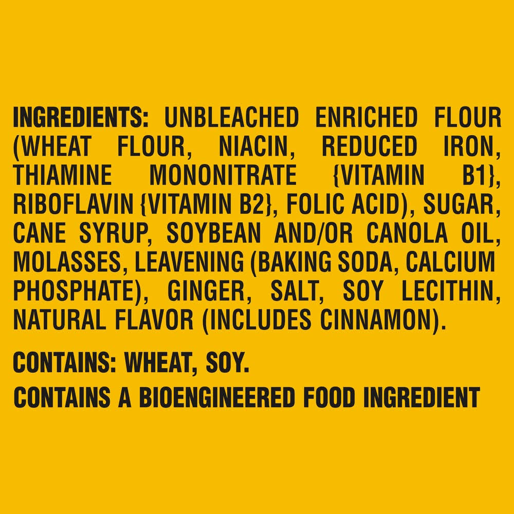 Ingredients: INGREDIENTS: UNBLEACHED ENRICHED FLOUR (WHEAT FLOUR, NIACIN, REDUCED IRON, THIAMINE MONONITRATE {VITAMIN B1}, RIBOFLAVIN {VITAMIN B2}, FOLIC ACID), SUGAR, CANE SYRUP, SOYBEAN AND, OR CANOLA OIL, MOLASSES, LEAVENING (BAKING SODA, CALCIUM PHOSPHATE), GINGER, SALT, SOY LECITHIN, NATURAL FLAVOR (INCLUDES CINNAMON), .CONTAINS: WHEAT, SOY. Contains: Wheat, Soy