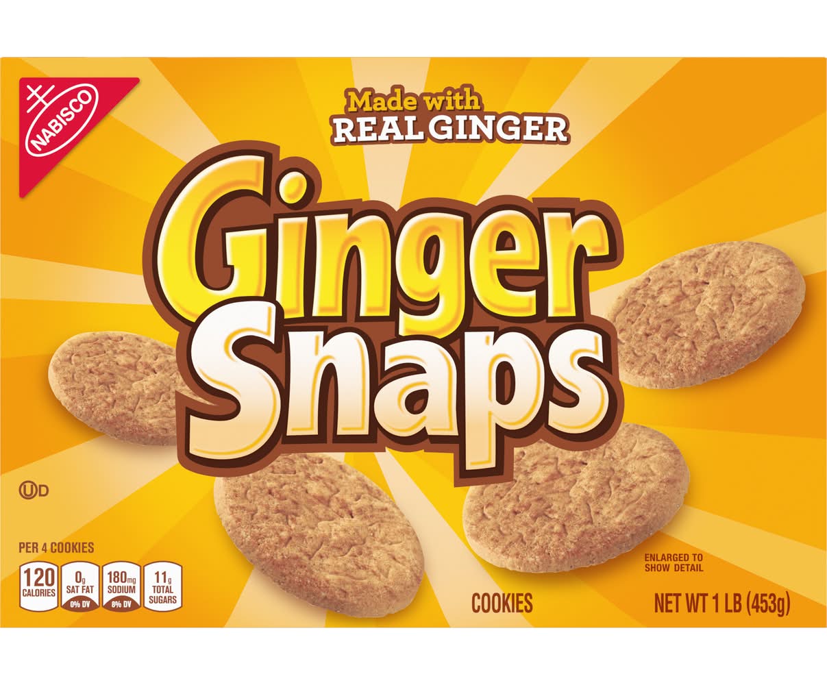 This is make it easy to enjoy a classic treat without baking from scratch. Made with real ginger and molasses, Nabisco Ginger Snaps have a classic flavor. Crispy round cookie snacks offer a classic crunchy texture for snacking satisfaction. They're the ideal size to grab for a snack or to enjoy with your tea. These ginger cookies also work to make a homemade pie crust for pumpkin or apple baked desserts. Keep a box of Ginger Snaps Cookies on hand, so you're always prepared for a sweet craving. Mondelez Global LLC, East Hanover, NJ 07936