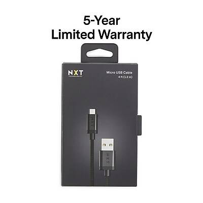 Crafted for durability and efficient charging, the Nxt Technologies Braided USB-A to Micro-USB Charging Cable measures 4 feet in length, providing ample reach for flexible placement in various settings such as vehicles or offices. Its braided design helps to prevent snags and tangles, enhancing the product's longevity and maintaining a neat appearance. The cable is designed with a strain-relief feature that allows it to endure up to 10,000 bend cycles, ensuring reliability and consistent charging performance over time. Integrated cable management straps are included to assist in keeping the cable organized and tangle-free. The product comes with a 5-year limited warranty, ensuring customer satisfaction and trust in its quality construction and functionality.