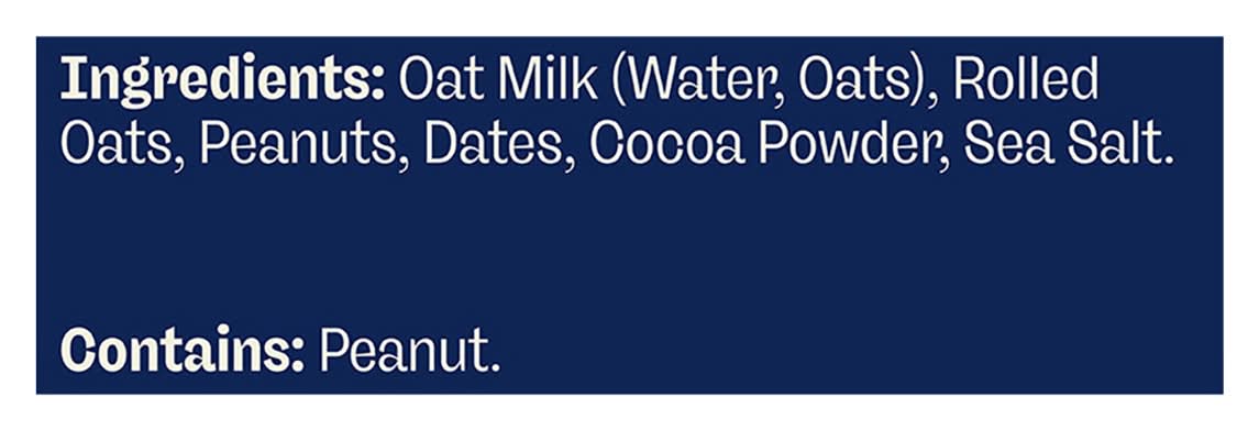 Ingredients: Oat Milk (Water, Oats), Rolled Oats, Peanuts, Dates, Cocoa Powder, Sea Salt Contains: Peanuts, Tree Nuts, Almonds, Tree Nuts, Coconuts, Milk, Peanuts