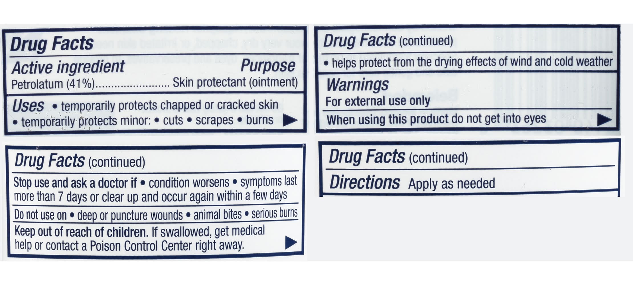 Active: Petrolatum (41%) Inactive: Mineral Oil, Ceresin, Lanolin Alcohol, Panthenol, Glycerin, Bisabolol