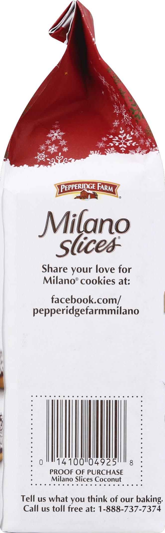 Limited edition. Per 3 Cookies: 150 calories; 4.5 g sat fat (23% DV); 45 mg sodium (2% DV); 9 g sugars. Unwrap something for yourself. Baked with no artificial flavors (just one more reason why they're so good). The ingredients from corn, soy, and sugar in this product come from genetically modified crops. Learn more at pepperidgefarm.com. Tell us what you think of our baking. Call us toll free at: 1-888-737-7374. Share your love for Milano cookies at: facebook.com/pepperridgefarmmilano. Baked in USA. CAMPBELL SOUP,