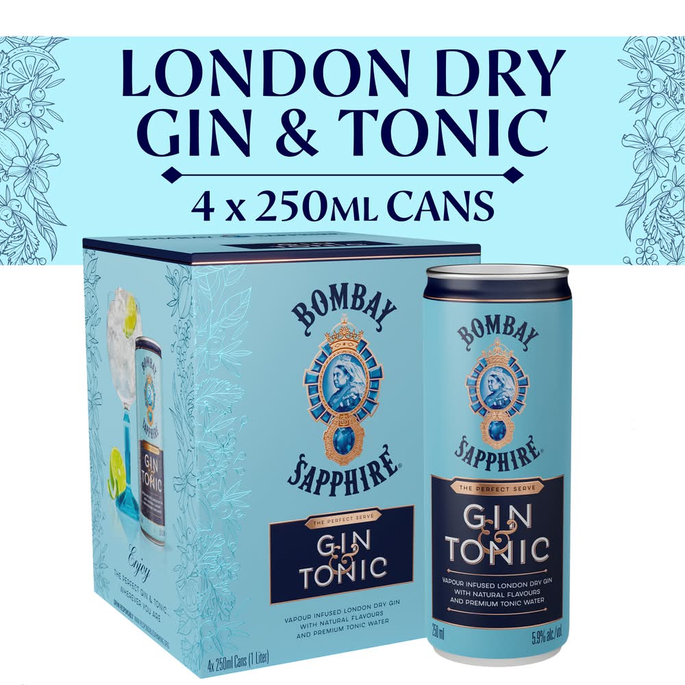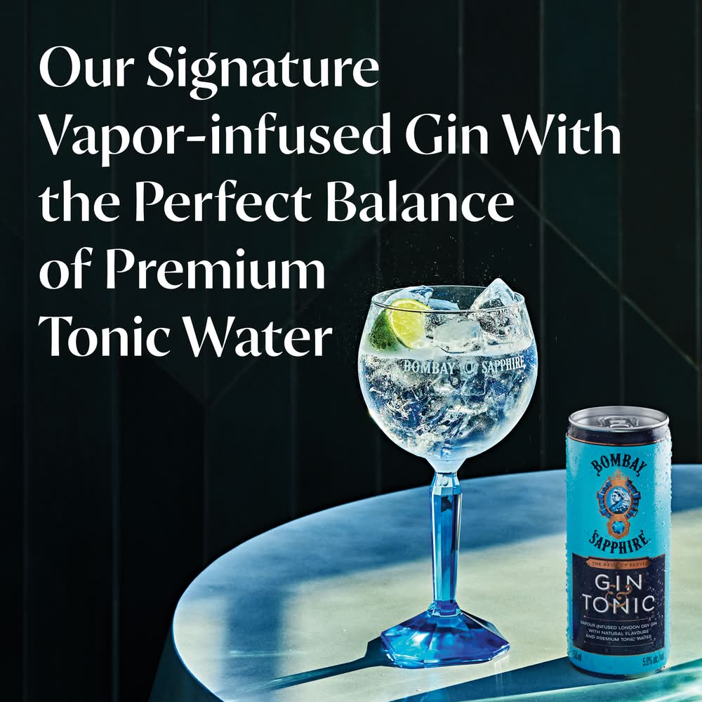 BOMBAY SAPPHIRE AND TONIC • Alcohol by volume: 5.9% • Bombay Spirits, • Packaging: Reusable