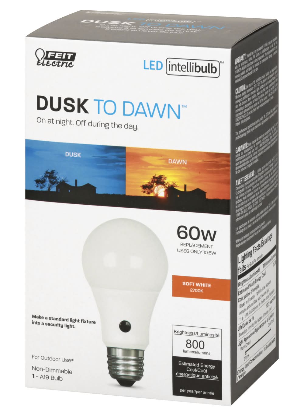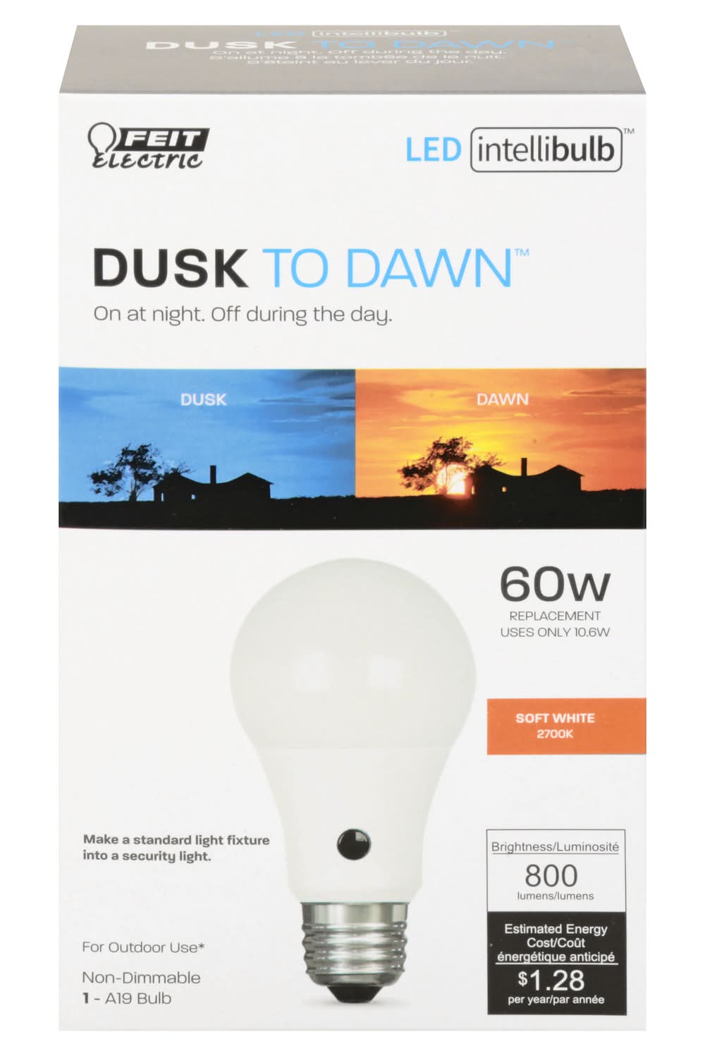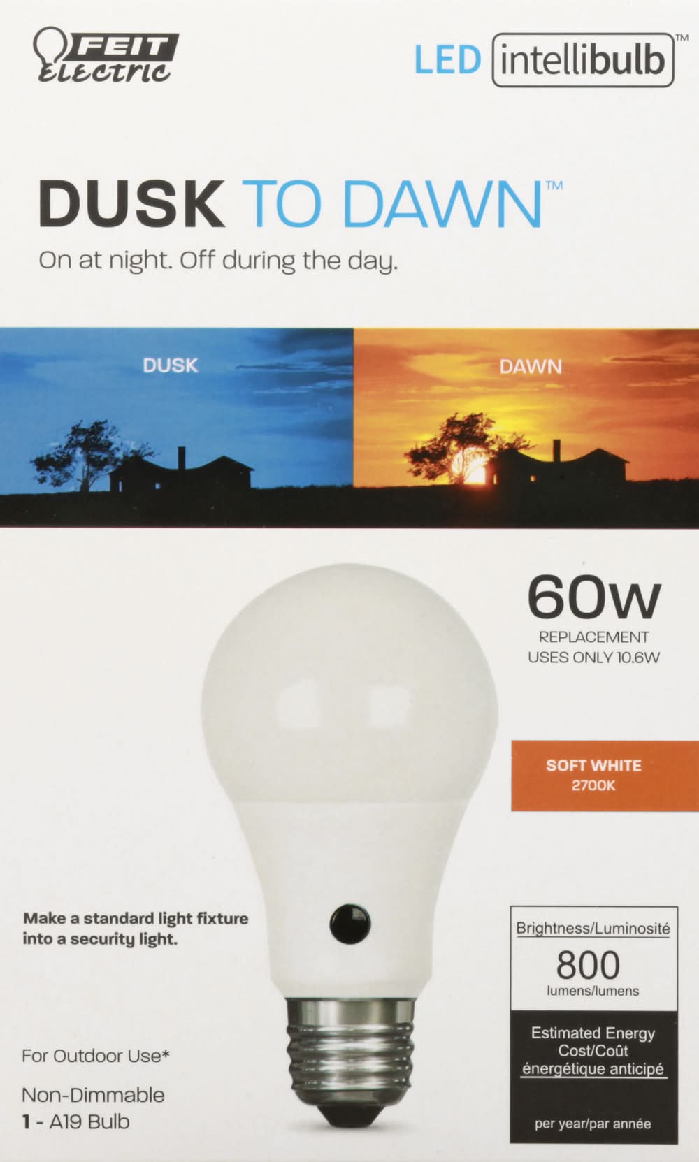 1 - A19 bulb. Dusk to Dawn: On at night. Off during the day. 60 w replacement. Uses only 10.6 w. Soft white 2700 K. Make a standard light fixture into a security light. For outdoor use (When used outdoors, do not expose directly to water). Non-dimmable. Brightness: 800 lumens. Estimated Energy Cost: $1.28. Light Output: 800 lumens. Energy Used: 10.6 watts. Life: 15000 hours. To save energy costs, find the bulbs with the light output you need, then choose the one with the lowest watts. Enhance: Vivid Natural Light: 90+ color rendering index (CRI) bulbs allow colors to appear more realistic and vibrant. Up to 15,000 hours of LED light. No smart home hardware app required. The performance specifications (Lumens, watts, life, CCT and CRI) printed on this product package should only be considered an approximation of expected performance. Meets CEC Title 20 Light Bulb Standars. UL listed. www.feit.com. Made in China. Brightness Quantity: 800 lumens. Energy Info: $1.28 based on 3 hrs/day, 11 cents/kWh. Cost depends on rates and use. 10.6 watts. Bulb Info: Outdoor. LED. Screw. Bulb Life: 13.7 years based on 3 hrs/day. Feit Electric Company, Pico Rivera, CA, 90660