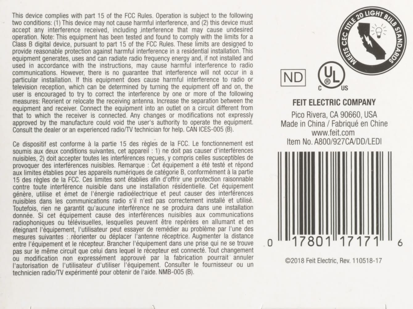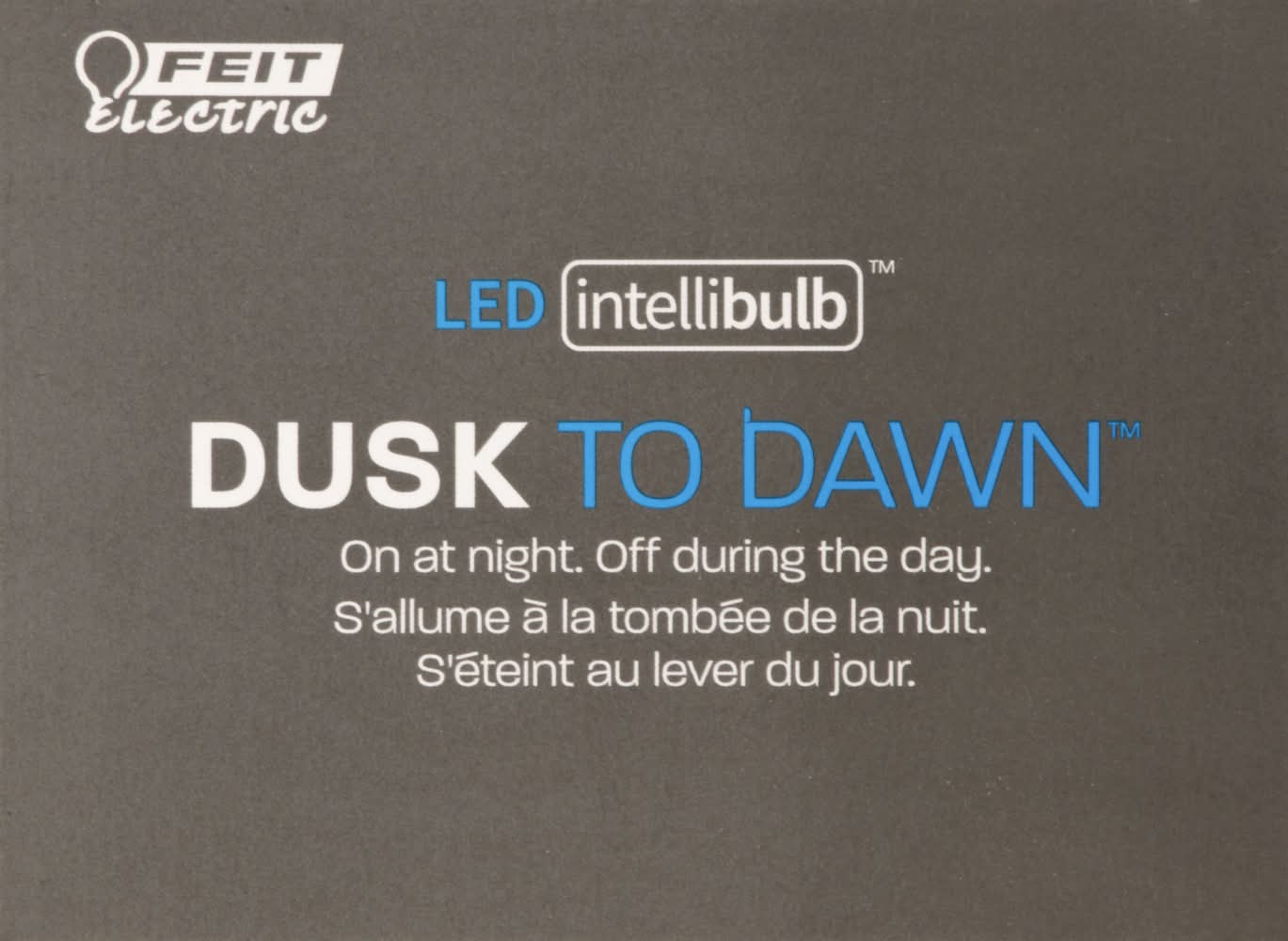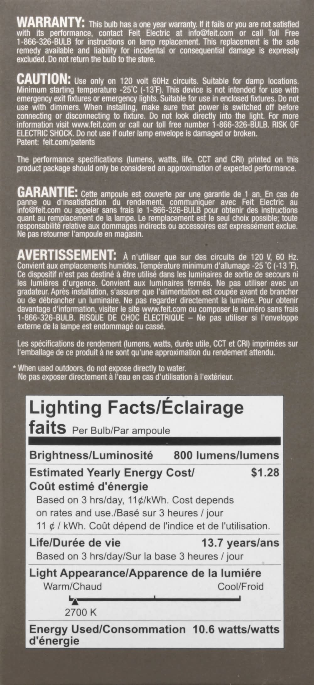 1 - A19 bulb. Dusk to Dawn: On at night. Off during the day. 60 w replacement. Uses only 10.6 w. Soft white 2700 K. Make a standard light fixture into a security light. For outdoor use (When used outdoors, do not expose directly to water). Non-dimmable. Brightness: 800 lumens. Estimated Energy Cost: $1.28. Light Output: 800 lumens. Energy Used: 10.6 watts. Life: 15000 hours. To save energy costs, find the bulbs with the light output you need, then choose the one with the lowest watts. Enhance: Vivid Natural Light: 90+ color rendering index (CRI) bulbs allow colors to appear more realistic and vibrant. Up to 15,000 hours of LED light. No smart home hardware app required. The performance specifications (Lumens, watts, life, CCT and CRI) printed on this product package should only be considered an approximation of expected performance. Meets CEC Title 20 Light Bulb Standars. UL listed. www.feit.com. Made in China. Brightness Quantity: 800 lumens. Energy Info: $1.28 based on 3 hrs/day, 11 cents/kWh. Cost depends on rates and use. 10.6 watts. Bulb Info: Outdoor. LED. Screw. Bulb Life: 13.7 years based on 3 hrs/day. Feit Electric Company, Pico Rivera, CA, 90660
