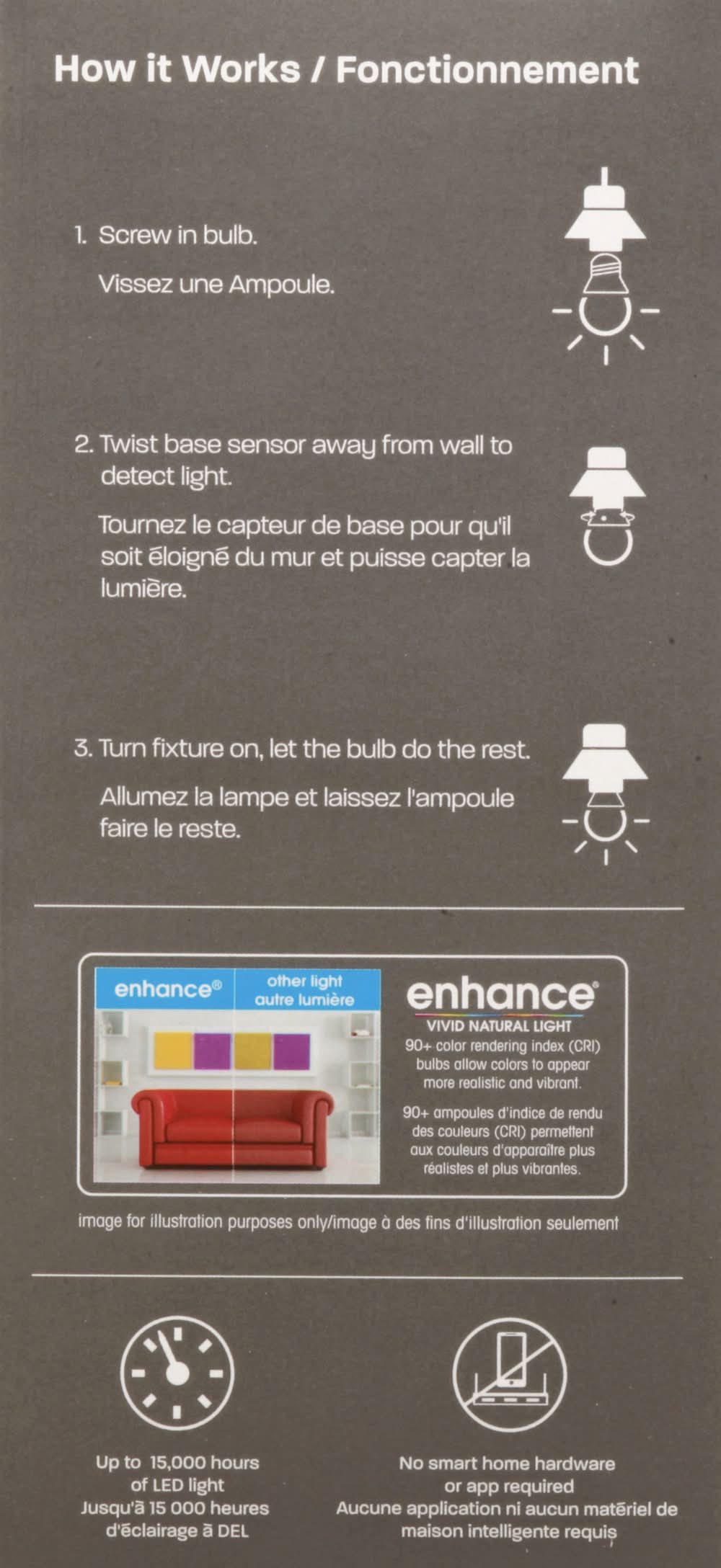 How it Works: 1. Screw in bulb. 2. Twist base sensor away from wall to detect light. 3. Turn fixture, let the bulb do the rest.