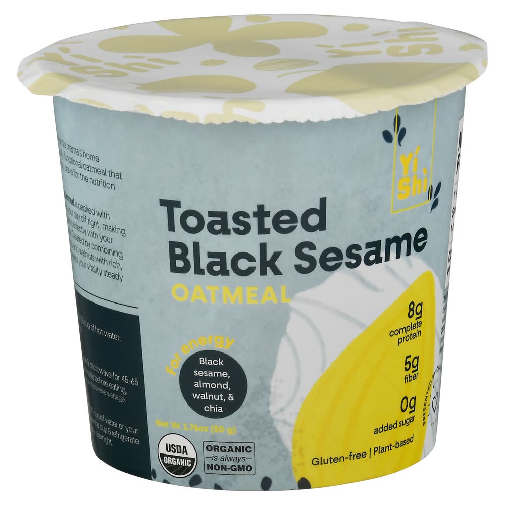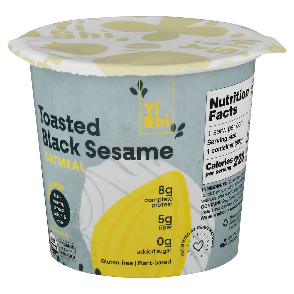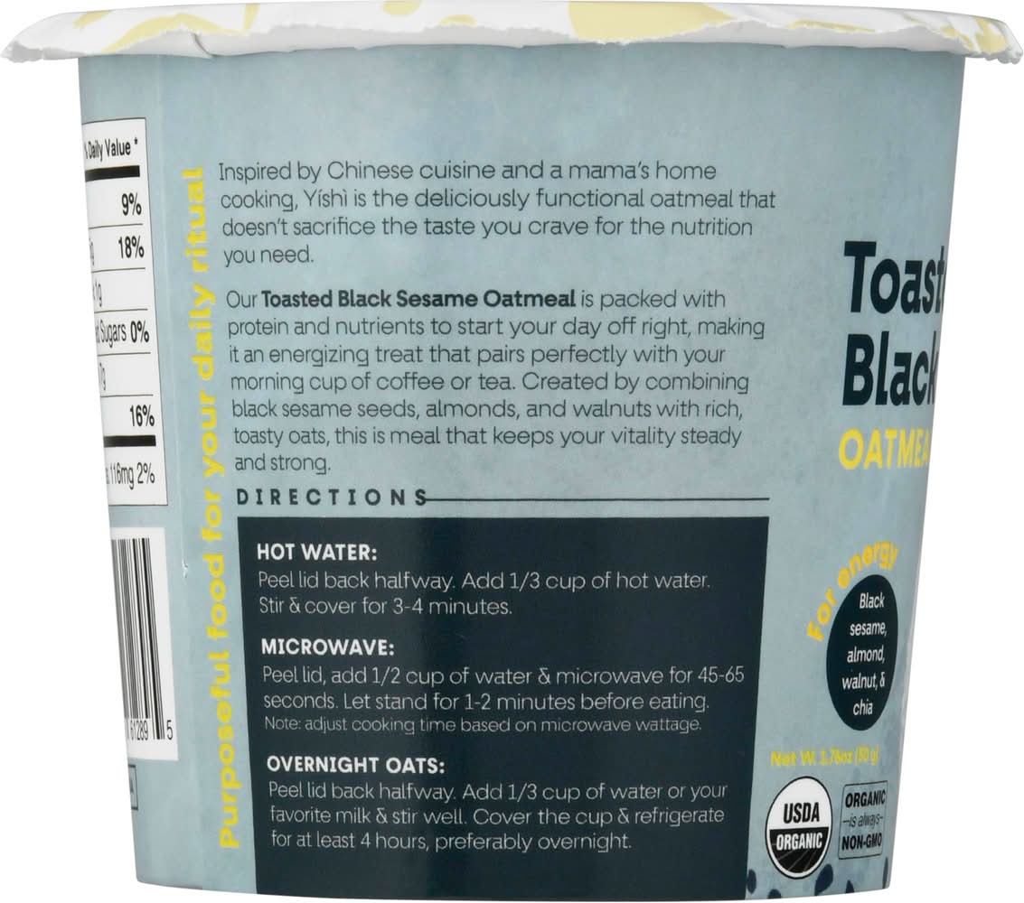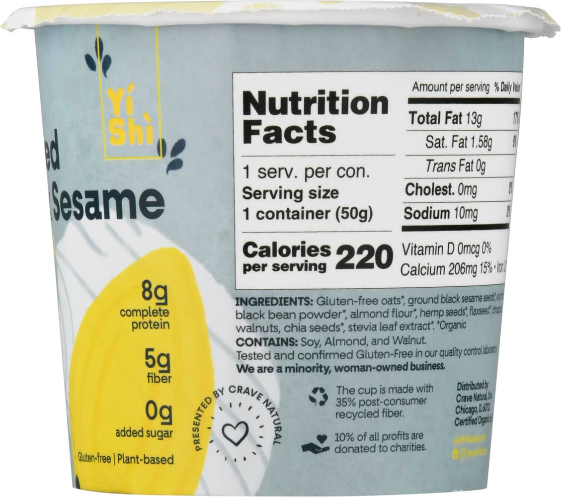 For energy black sesame, almond walnut, & chia. 8 g complete protein. 5 g fiber. 0 g added sugar. USDA Organic. Gluten-free. Certified Organic by OTCO. Tested and confirmed Gluten-Free in our quality control laboratory. Organic is always Non-GMO. Plant-based. Purposeful food for your daily ritual. Inspired by Chinese cuisine and a mama's home cooking, Yishi is the deliciously functional oatmeal that doesn't sacrifice the taster you crave for the nutrition you need. Our Toasted Black Sesame Oatmeal is packed with protein and nutrients to start your day off right, making it an energizing treat that pairs perfectly with your morning cup of coffee or tea. Created by combining black sesame seeds, almonds, and walnuts with rich, toasty oats, this is meal that keeps your vitality steady and strong. Presented by Crave Natural. yishifoods.com. Facebook. Instagram. (at)yishifoods. We are a minority, woman-owned business. The cup is made with 35% post-consumer recycled fiber. 10% of all profits are donated to charities. Made in USA. Crave Natural, Inc.,