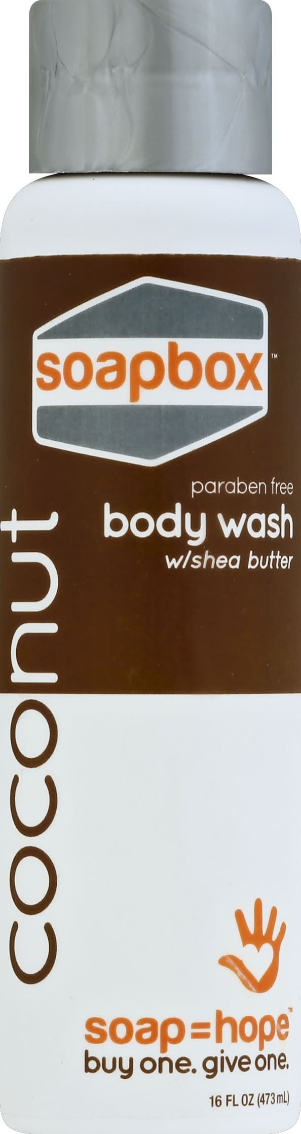 Paraben free. Soap = hope. Buy one. Give one. This body wash is good. Say Aloha to radiant skin with SoapBox Coconut body wash. Rich in vitamins E & K, antioxidants and fatty acids, coconut oil soaks into your skin to lock in moisture. Mixed generously with shea butter, this decadent body wash heals rough skin so you can put on your grass skirt and hula the day away. This body wash does good. SoapBox's mission is to empower people to change the world through everyday, quality purchases. That's why this bottle also gives back a bar of soap to a person in need. Visit www.soapboxsoaps.com/hope and type in the code below to find out where in the world you are doing good. Free From: parabens, phthalates, EDTA & artificial colorants. Cruelty free, not tested on animals. soapboxsoaps.com. Facebook. Twitter. how2recycle.info. Certified B Corporation. Made in USA. SOAPBOX SOAPS,