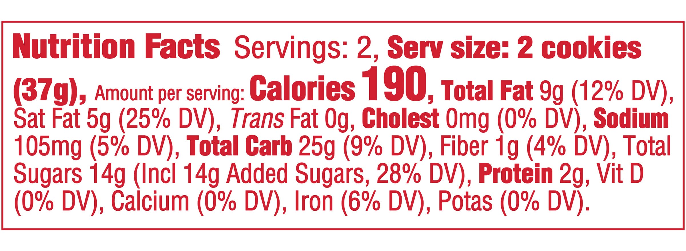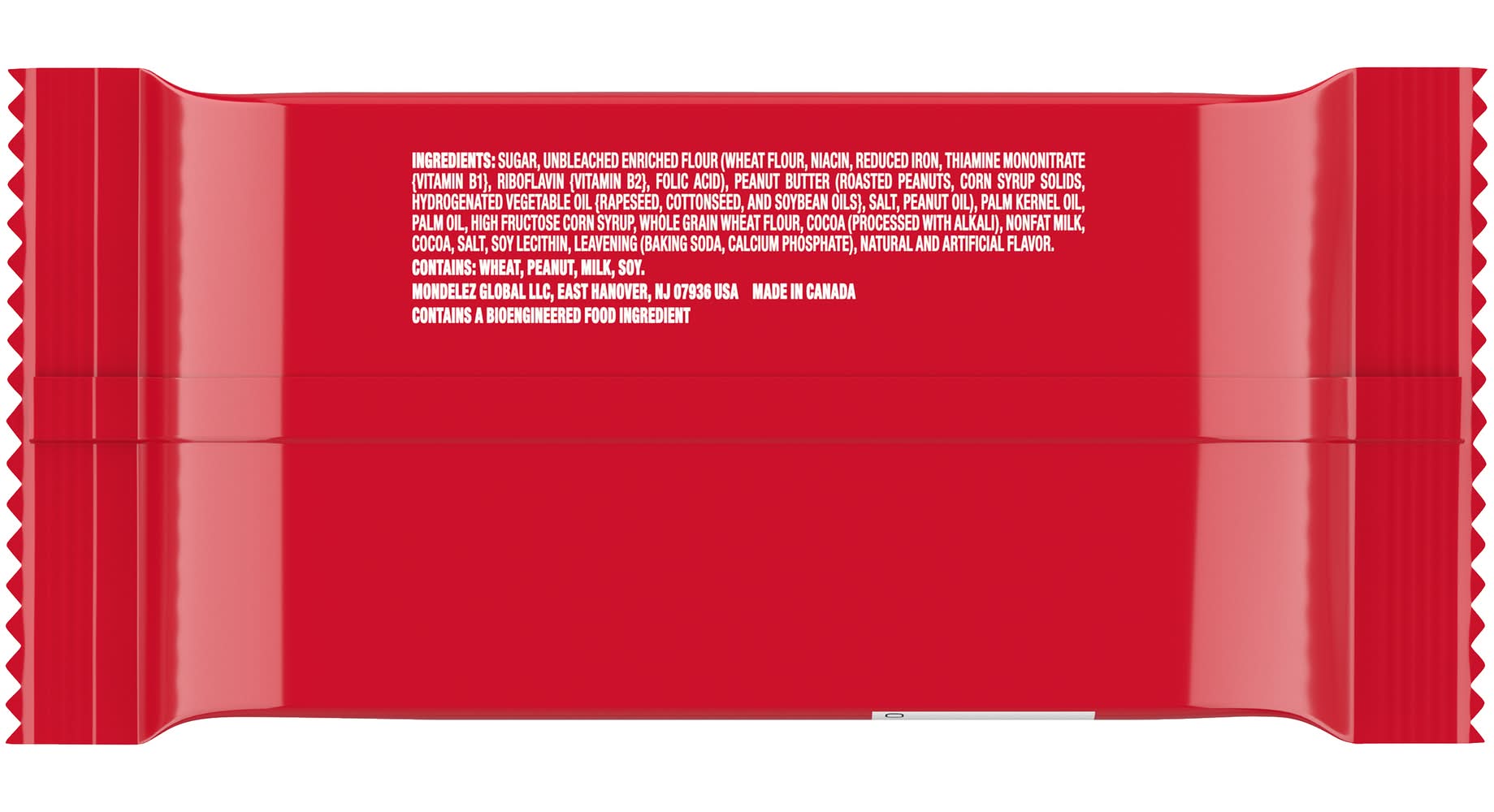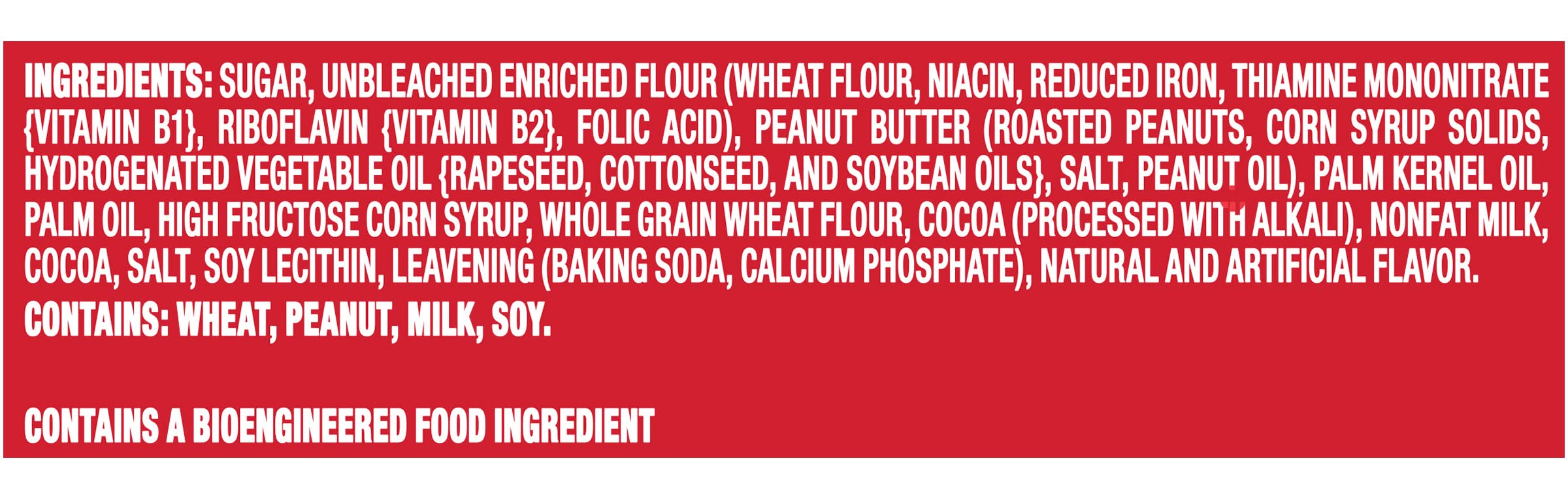 Ingredients: Sugar, Unbleached Enriched Flour (Wheat Flour, Niacin, Reduced Iron, Thiamine Mononitrate {vitamin B1}, Riboflavin {vitamin B2}, Folic Acid),, Peanut Butter (Peanuts, Corn Syrup Solids, Hydrogenated Rapeseed and/or Cottonseed and/or Soybean Oils, Salt, Peanut Oil),, Palm Kernel Oil, Palm Oil, High Fructose Corn Syrup, Whole Grain Wheat Flour, Cocoa (Processed With Alkali), Nonfat Milk, Cocoa, Salt, Soy Lecithin, Cornstarch,, Leavening (Baking Soda, Calcium Phosphate), Artificial Flavor, Natural Flavor. Contains: CONTAINS: WHEAT, PEANUT, MILK, SOY.