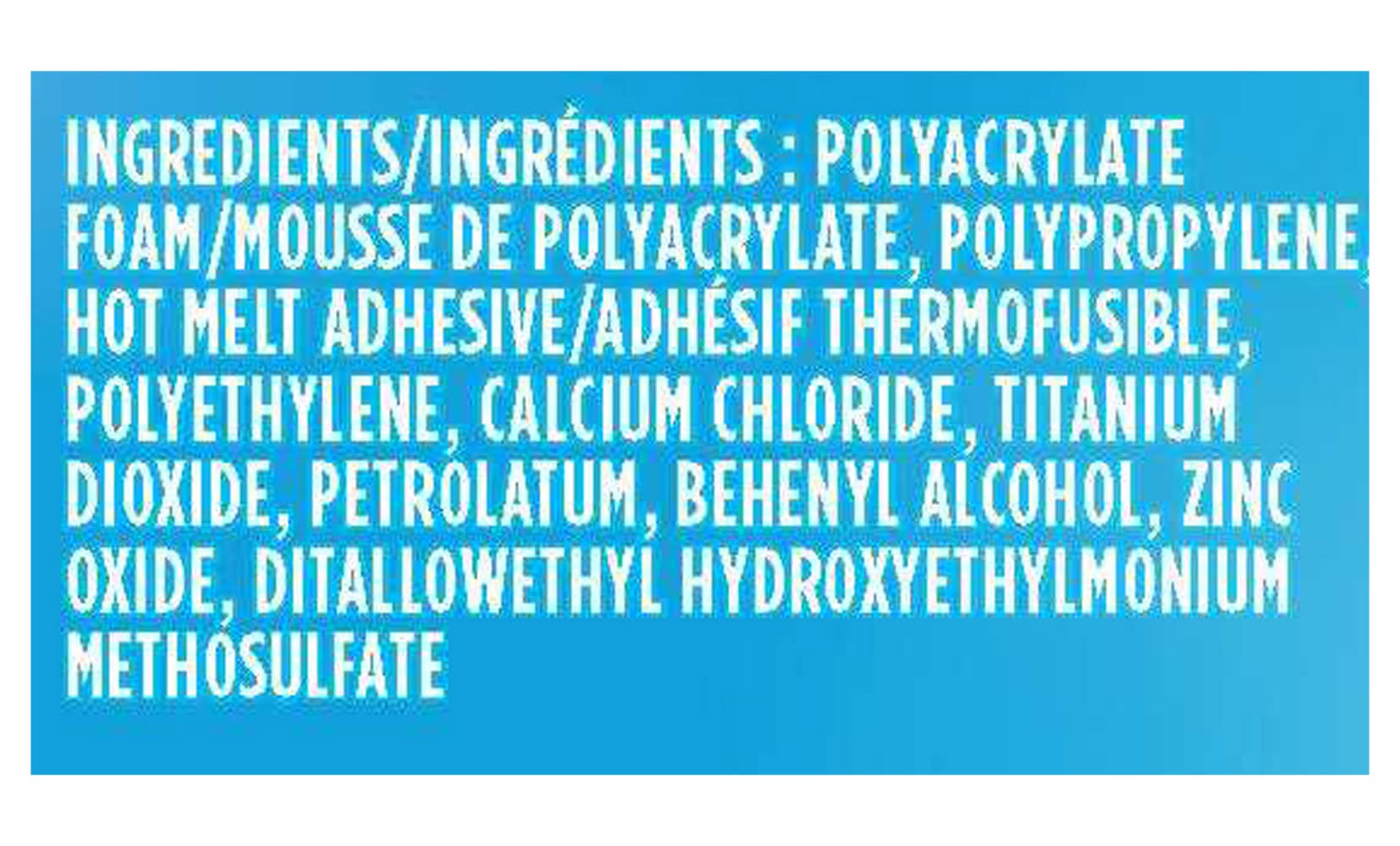 Polyacrylate Foam, Polypropylene, Hot Melt Adhesive, Polyethylene, Calcium Chloride, Titanium Dioxide, Petrolatum, Behenyl Alcohol, Zinc Oxide, Ditallowethyl Hydroxyethylmonium Methosulfate