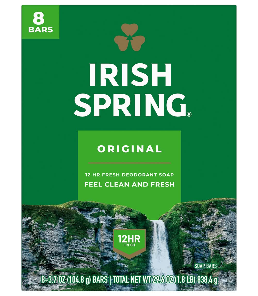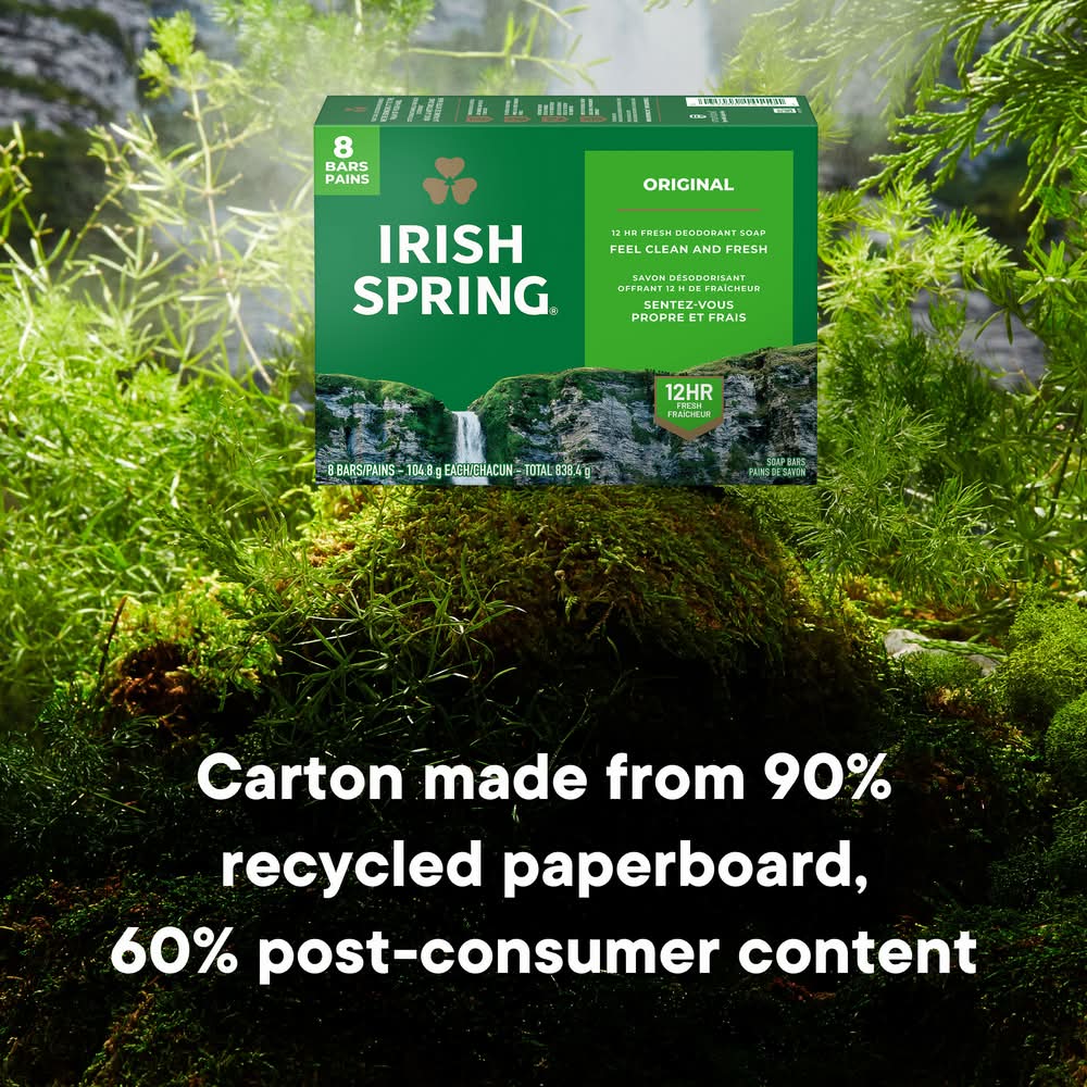 Irish Spring Original Clean Deodorant Bar Soap, 8 Pack Smell like you came from a nice-smelling place with Irish Spring Bar Soap. Count on Irish Spring Original Bar Soap to leave your skin feeling clean — our original bar soap for men is made with a 98% naturally derived formula that keeps you fresh for 12 hours. Fresh Look, Great Smell Feel clean, smell serene with the new Irish Spring. Our recyclable carton might have a new design, but it’s still the same great bar soap you love. Our packaging refresh is all part of our master plan to bring the amazing places you love to smell straight to your bathroom. Get as fresh as the great outdoors and add some adventure to your everyday with the whole line of body washes and bar soaps for men. We want you to smell as great as you feel, so you can focus on moments that turn into memories. Bar Soap for Body and Hands Irish Spring Original Bar Soap has a sudsy lather that washes away bacteria, so you can use it as a hand soap bar and keep the fresh smell going all day long. Plus, this soap bar is mild for skin. It’s paraben, phthalate and gluten free and has flaxseed oil. Feel good while washing your hands and body with Irish Spring. Irish Spring Bar Soap Pack Never go without smelling your best. The Irish Spring bar soap pack is conveniently packaged so that you can stock up. Keep some in your bathroom, in the pantry, give some to your friends and keep the good smells going. • Size: 8 CT • Colgate-Palmolive Company, New York, NY, 10022 • Packaging: Reusable