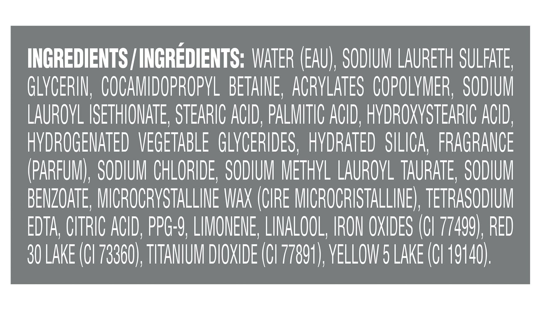 Ingredients: Water (Eau), Sodium Laureth Sulfate, Glycerin, Cocamidopropyl Betaine, Acrylates Copolymer, Sodium Lauroyl Isemionate, Stearic Acid, Palmitic Acid, Hydroxystearic Acid, Hydrogenated Vegetable Glycerides, Hydrated Silica, Fragrance (Parfum), Sodium Chloride, Sodium Methyl Lauroyl Taurate, Sodium Benzoate, Microcrystalline Wax, Tetrasodium EDTA, Citric Acid, PPG-9, Limonene, Linalool, Iron Oxides (CI 77499), Red 30 Lake (CI 73360), Titanium Dioxide (CI 77891), Yellow 5 Lake (CI 19140)