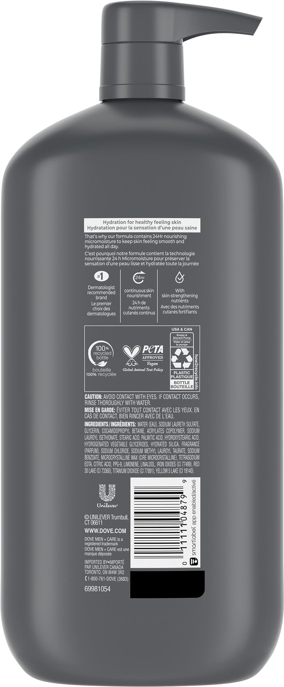 Vegan. New size. No. 1 dermatologist recommended brand. +24hr Nourishing micromoisture. Hydration for healthy feeling skin. That's why our formula contains 24Hr nourishing micromoisture to keep skin feeling smooth and hydrated all day. 24Hr continuous skin nourishment. With skin-strengthening nutrients. www.dove.com. how2recycle.info. SmartLabel app enabled. Call 1-800-761-DOVE (3683). 100% Recycled bottle. PETA Approved. Global animal test policy. • Size: 30 OZ • Packaging: Reusable