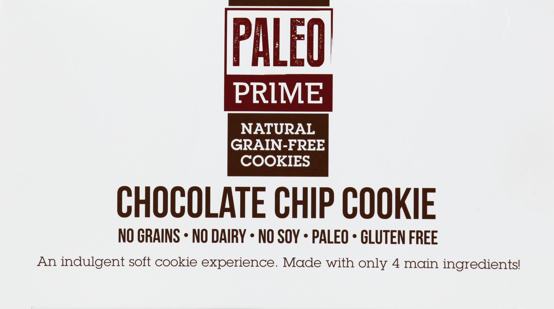 Natural. No grains. No dairy. No soy. Paleo. Gluten free. An indulgent soft cookie experience. Made with only 4 main ingredients. 5 g protein. Dairy free. Find out more: paleoprimefoods.com. Facebook. Twitter. Instagram. www.paleoprimefoods.com. PALEO PRIME FOODS,