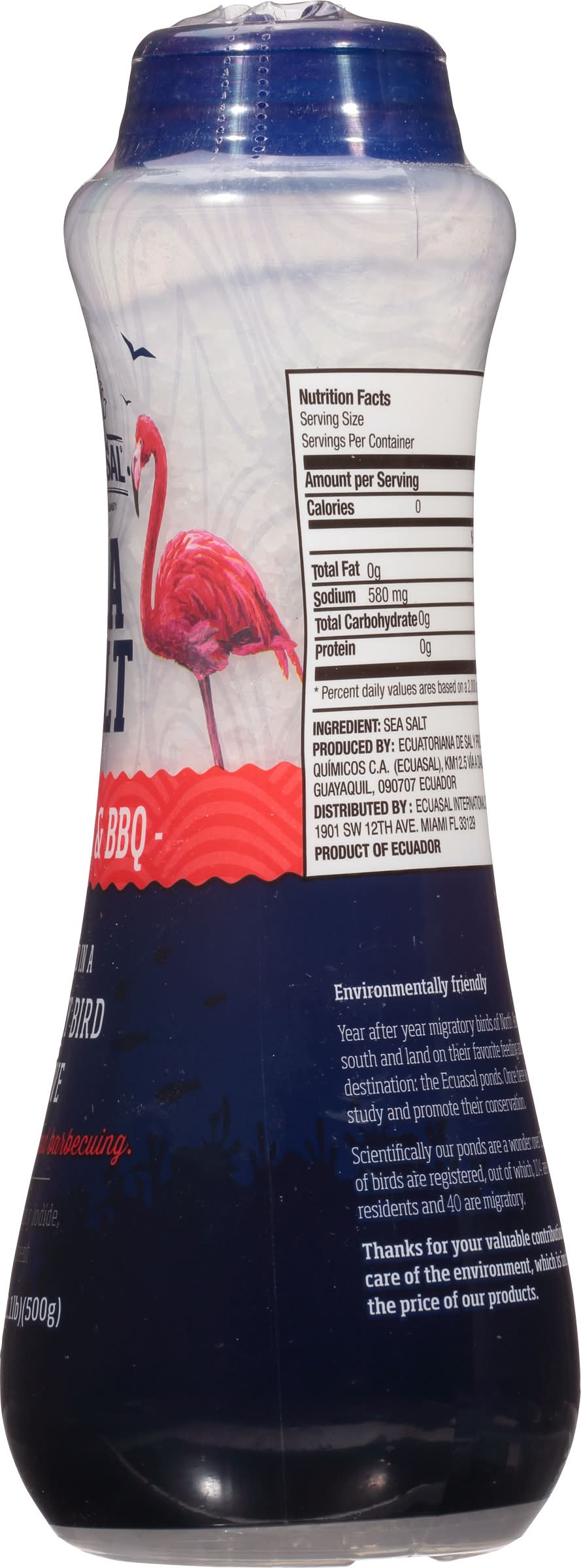 Tradition quality. Harvested in a migratory bird reserve. This salt does not supply iodide, a necessary nutrient. Saltier for less. 100% natural. Environmentally-friendly. Year after year migratory birds of North America travel south and land on their favorite and resting destination; the Ecuasal ponds. Once here we protect, study and promote their conservation. Scientifically our ponds are a wonder; over 135 species of birds are registered, out of which, 104 are our aquatic residents and 40 are migratory. Thanks for your valuable contribution to the care of the environment, which is included in the price of our products. From South America. Product of Ecuador. • Ecuasal International Corp., 1901 SW 12th Ave.,Miami,FL,33129 • Packaging: Reusable
