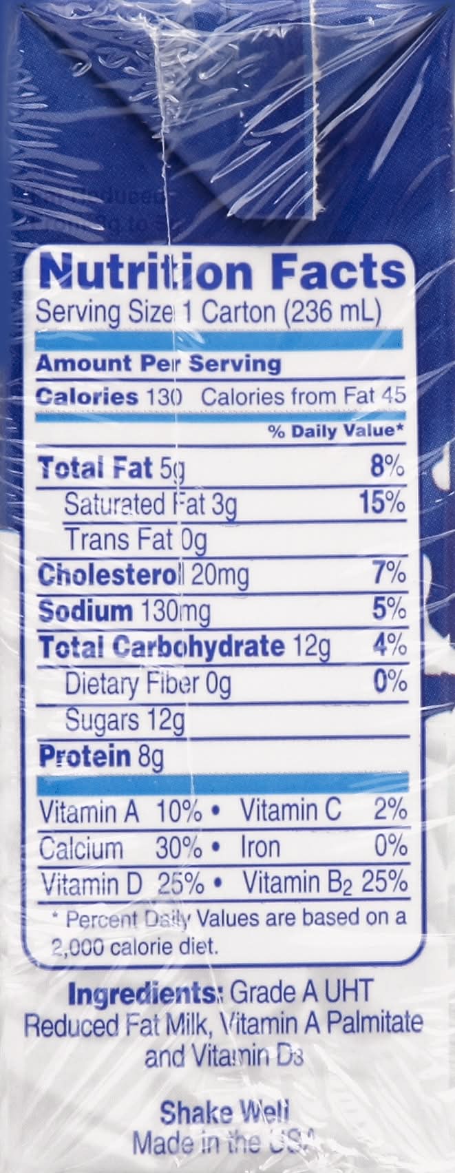 Grade A UHT Reduced Fat Milk, Vitamin A Palmitate and Vitamin D3. Contains: None Additives: None