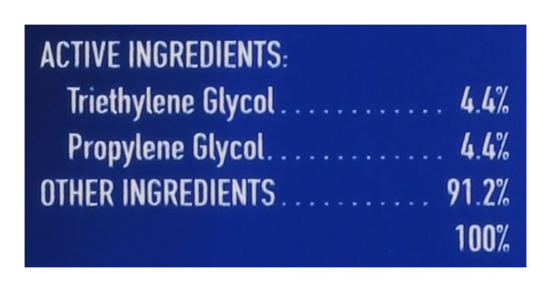 Ingredients: Active Ingredients: Triethylene Glycol (4.4%), Propylene Glycol (4.4%), Other Ingredients (91.2%), 100%