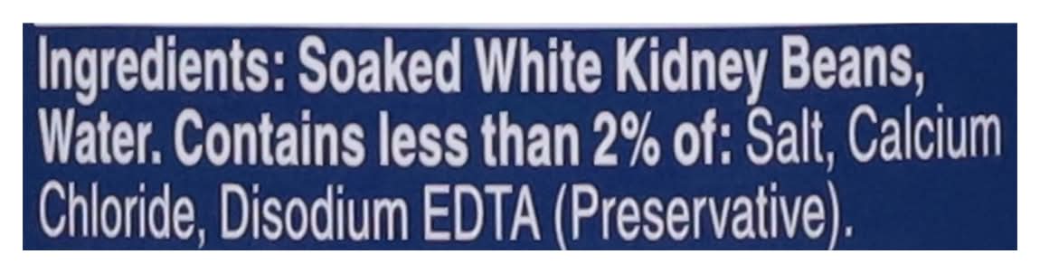 Ingredients: Soaked White Kidney Beans, Water. Contains Less than 2% of: Salt, Calcium Chloride, Disodium EDTA (Preservative)