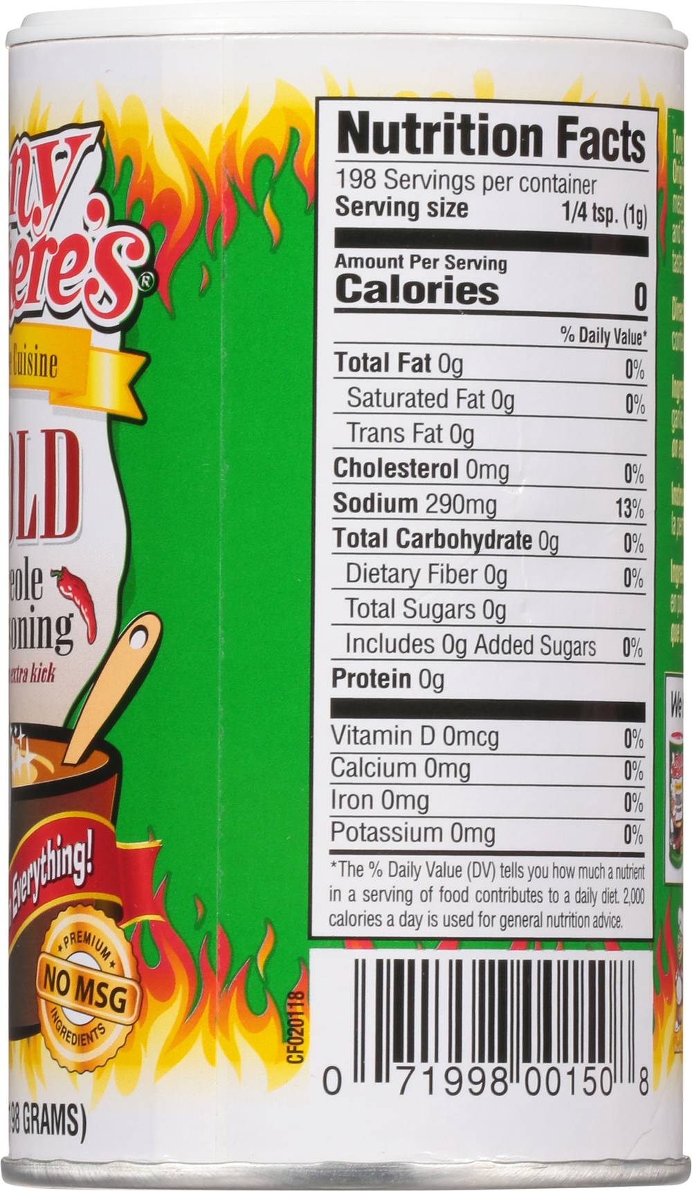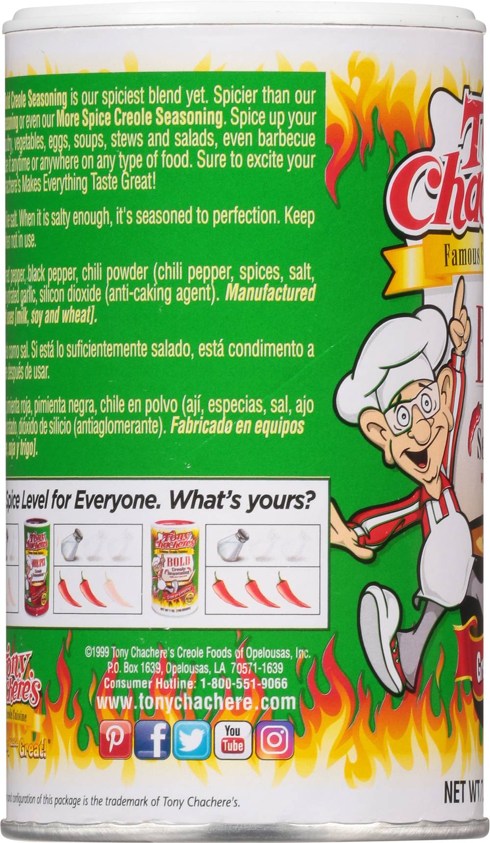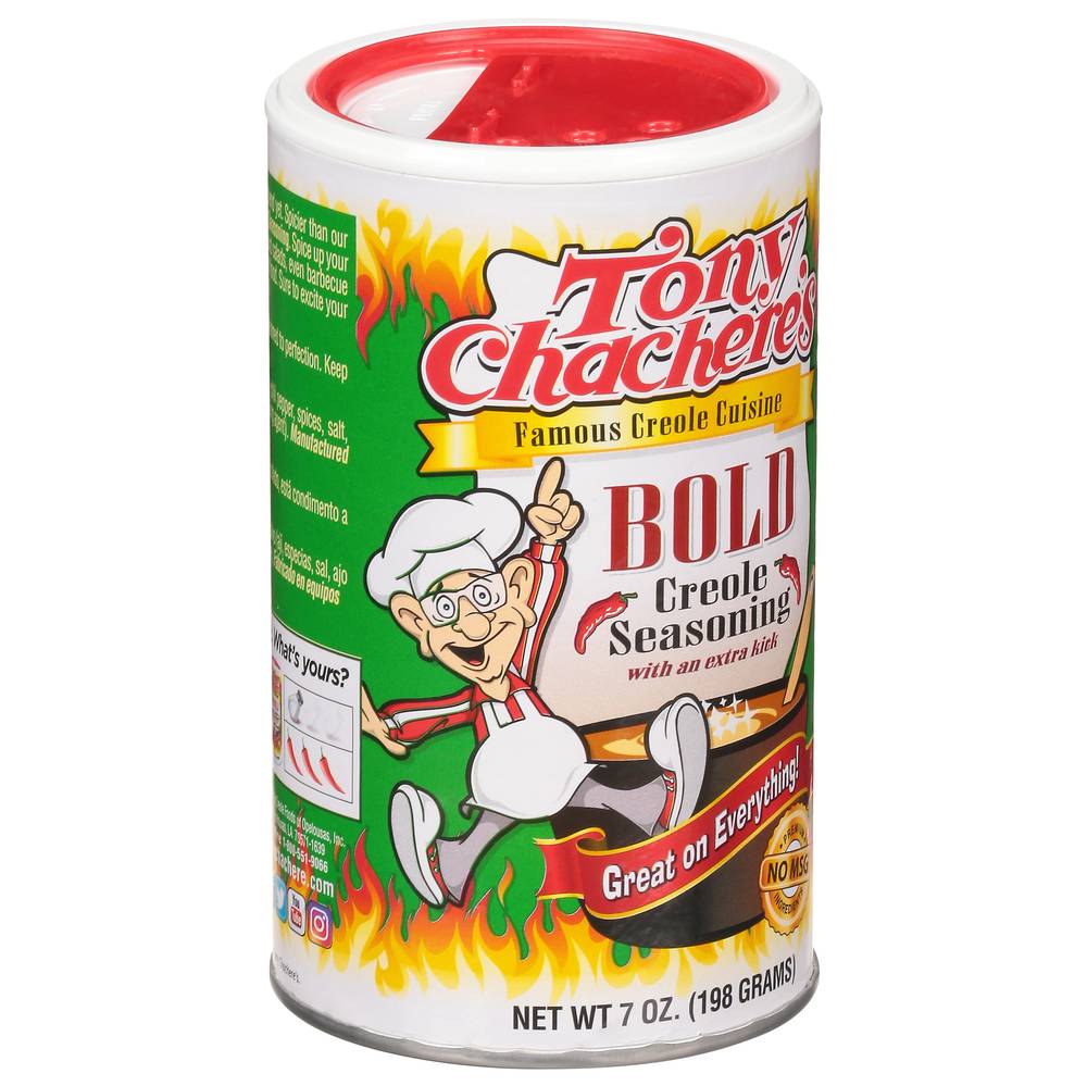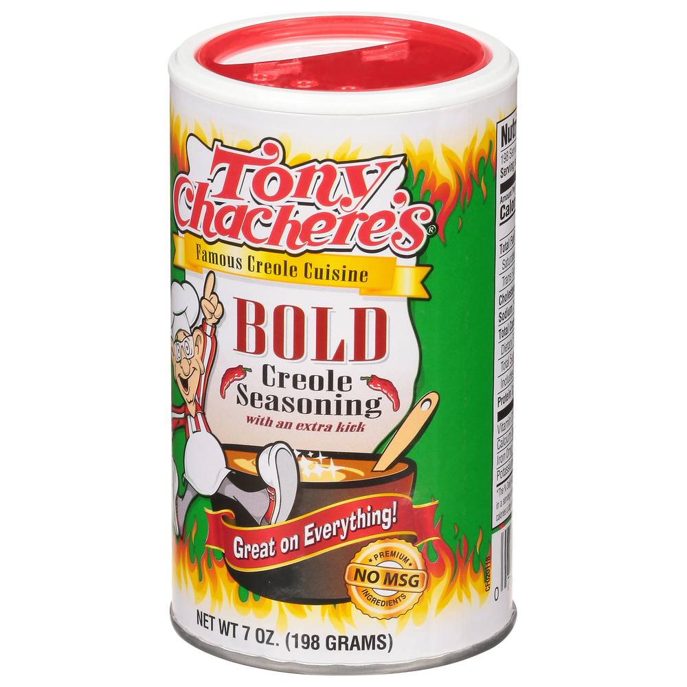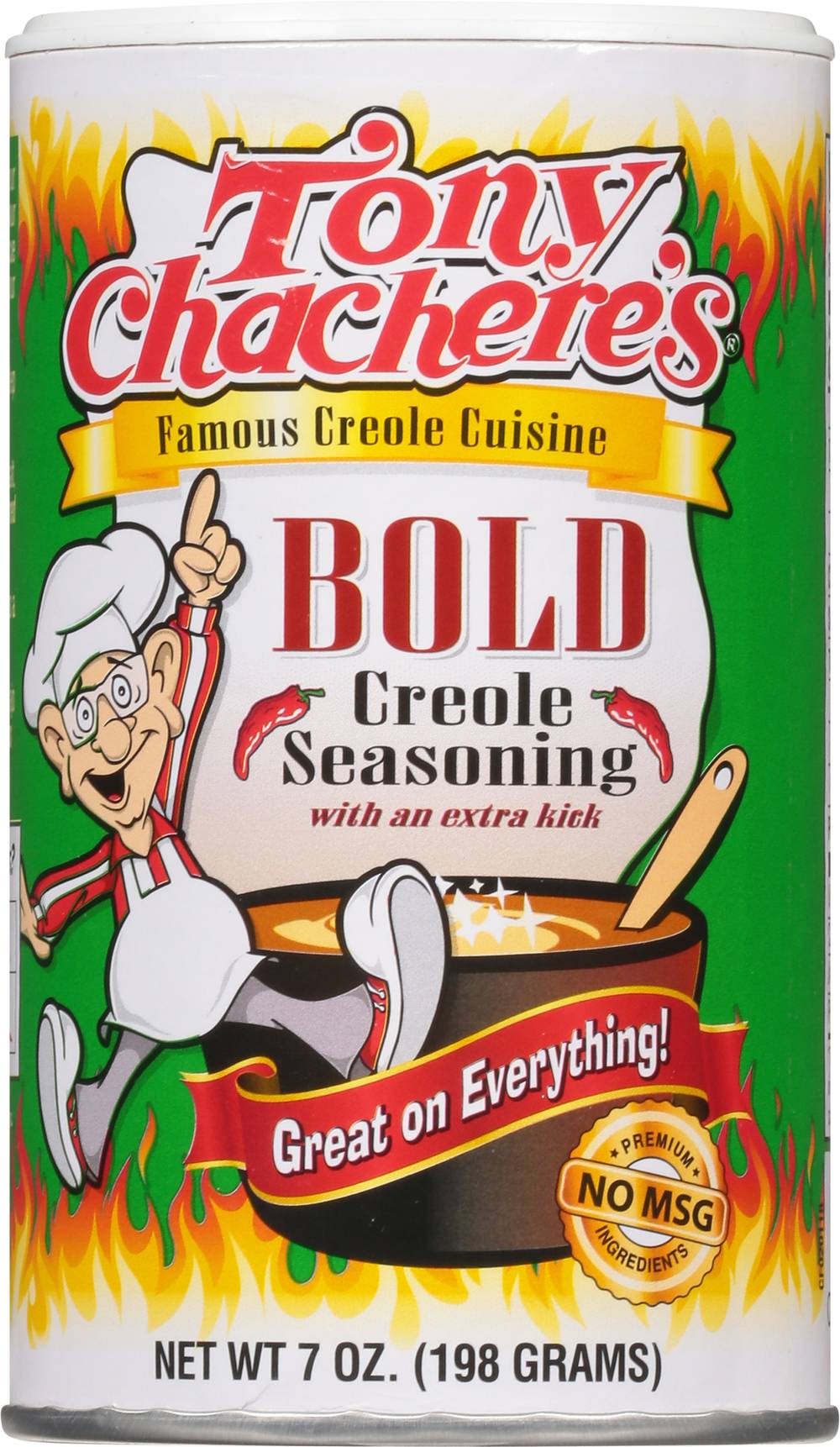 Creole seasoning with an extra kick. No MSG: Premium ingredients. Famous Creole cuisine. Great on everything! Tony Chachere's Bold Creole Seasoning is our spiciest blend yet. Spicier than our Original Creole Seasoning or even our More Spice Creole Seasoning. Spice up your meats, seafood, poultry, vegetables, eggs, soups, stews and salads, even barbecue and French fries. Use it anytime or anywhere on any type of food. Sure to excite your taste buds. Tony Chachere's makes everything taste great! www.tonychachere.com. Pinterest. Facebook. Twitter. YouTube. Instagram. Consumer Hotline: 1-800-551-9066. www.tonychachere.com. We have a spice level for everyone. What's yours? Original Creole Seasoning; More Spice Creole Seasoning; Bold Creole Seasoning. Tony Chachere's Creole Foods of Opelousas, Inc., PO Box 1639,Opelousas,LA,70571-1639